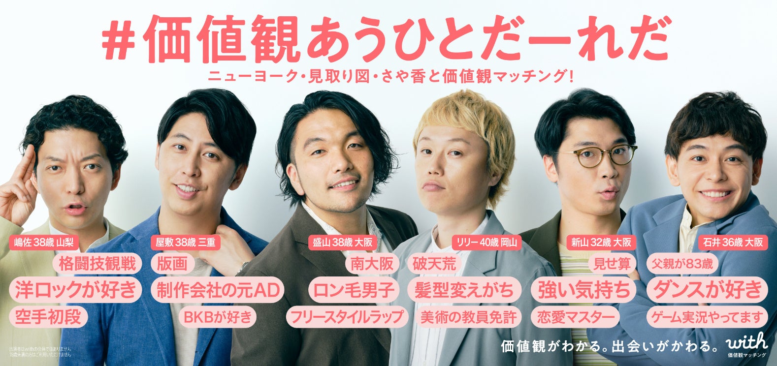 株式会社エニトグループの下で、20代中心に価値観重視の出会いを提供しているマッチングアプリ『with』を手掛ける株式会社with(東京都渋谷区、代表取締役CEO五十嵐昭人)は、現在展開中の「価値観がわかる。出会いがかわる。」キャンペーンの第二弾として8月7日(水)、本キャンペーンのアンバサダーを務めるニューヨーク、見取り図、さや香の6人の芸人との価値観マッチングが体験できる「#価値観あうひとだーれだ」チャレンジを開始します。またこのチャレンジでは、ご自身の価値観とマッチする方が『with』内に何人いるかを知ることもできます。さらに同日より、ご自身の価値観を一枚の画像で表現するジェネレーターコンテンツ「#価値観マッピング」の提供も開始します。10月31日(木)までの「価値観がわかる。出会いがかわる。」キャンペーン期間中、マッチングアプリ『with』では、さまざまな体験やコンテンツを通じて20代の皆様に価値観マッチングをお楽しみいただくことで、出会いにおける価値観の重要性をお伝えしてまいります。