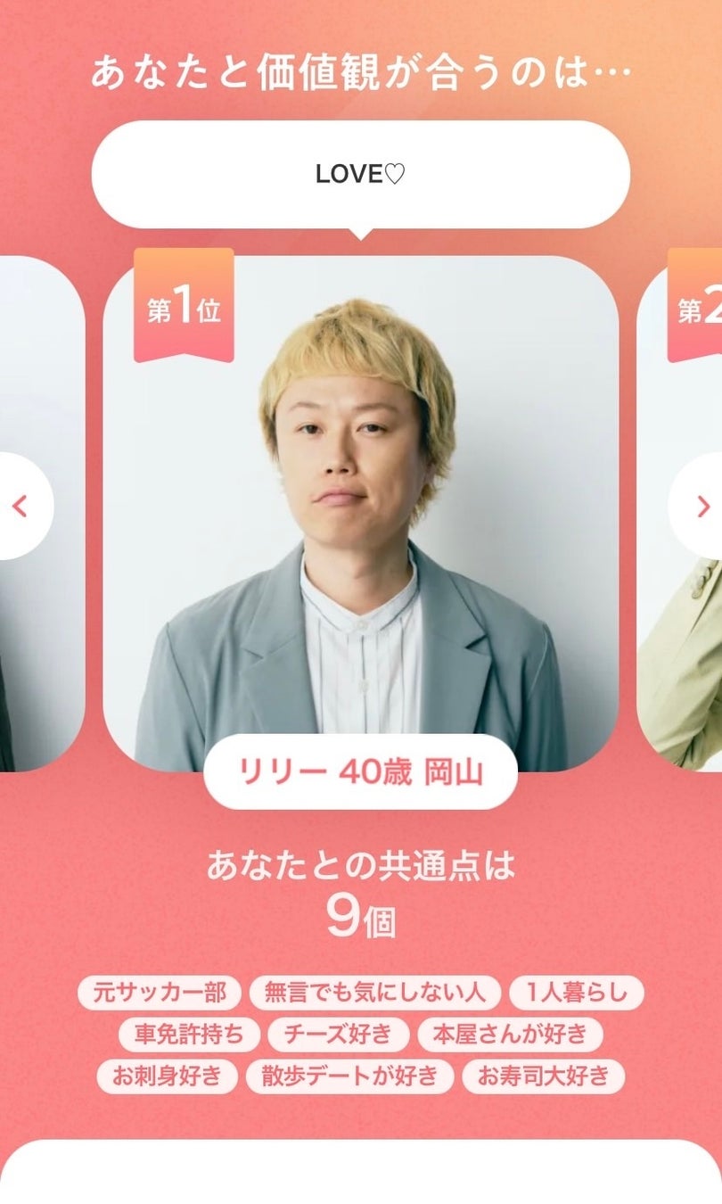 「価値観がわかる。出会いがかわる。」キャンペーンの第二弾として、8月7日(水)より、マッチングアプリ『with』のUIを一部再現したような特設キャンペーンサイト(https://with-kachikan.com/?match)にて、スポーツや音楽、グルメ、恋愛、仕事・生活、ファッションなどの11カテゴリーの中からご自身が大切にしている価値観や好きなことなどを最大30個まで選択することで、本キャンペーンのアンバサダーを務める芸人のニューヨーク、見取り図、さや香の6人それぞれとの相性がわかる「#価値観あうひとだーれだ」チャレンジを開始します。また、選択いただいたご自身の価値観とマッチする方が『with』内に何人いるか、そしてその方々がどのような価値観を持っているのかを知ることもできます。この「#価値観あうひとだーれだ」チャレンジを体験された方全員に、アプリ内で使える1,000円分のクーポンをプレゼントいたします。
