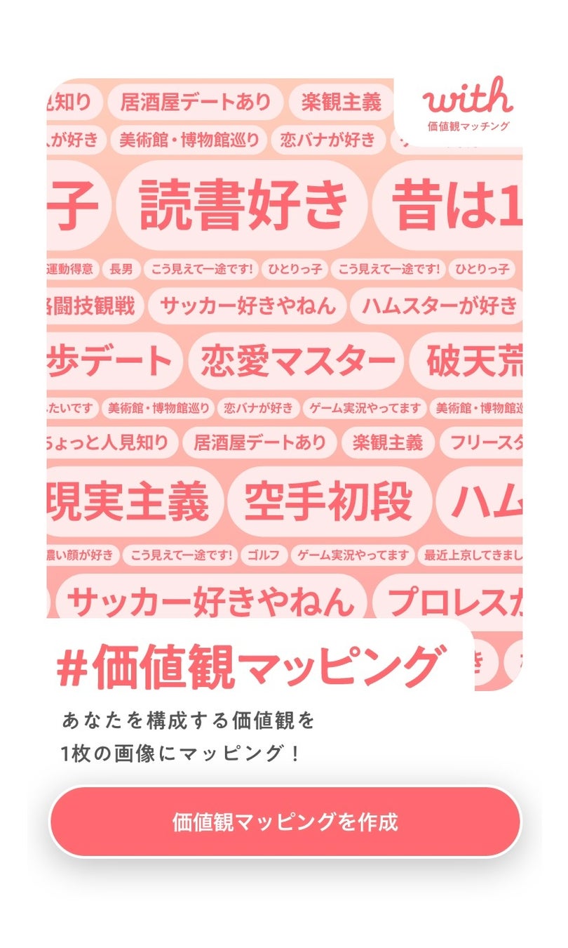 マッチングアプリ『with』は、2015 年9 ⽉にサービスを開始した、主に20 代の⽅に真⾯⽬な出会いの場としてご利⽤いただいている、価値観でマッチング可能な恋活・婚活マッチングアプリです。