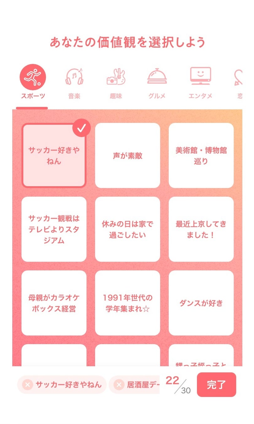 2)スポーツや音楽、グルメ、恋愛、仕事・生活、ファッションなどの11のカテゴリーに表示される内容から、ご自身の価値観にあうものを最大30個まで選択してください。
