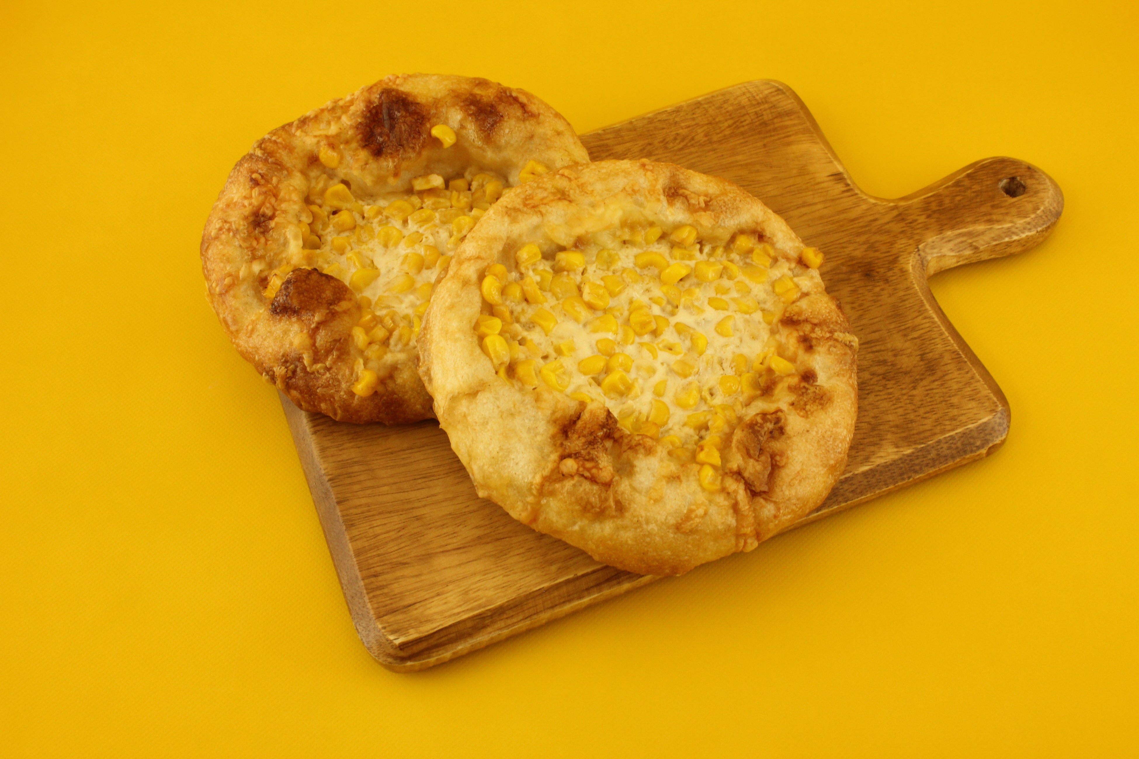ロデヴ生地に醤油マヨであえた北海道十勝産のコーンをのせ焼き上げました。