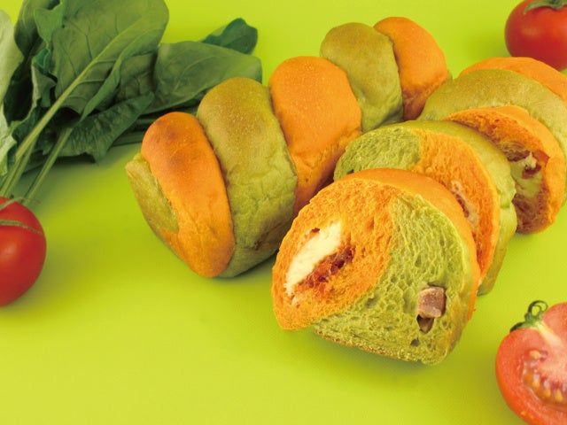 トマト生地にチーズフィリングとセミドライトマトを入れ、ほうれん草生地にベーコンを入れて編み込み、焼き上げました。トマトの『赤』とほうれん草の『緑』で作られた鮮やかな見た目は、パッと明るい気持ちにさせてくれます。