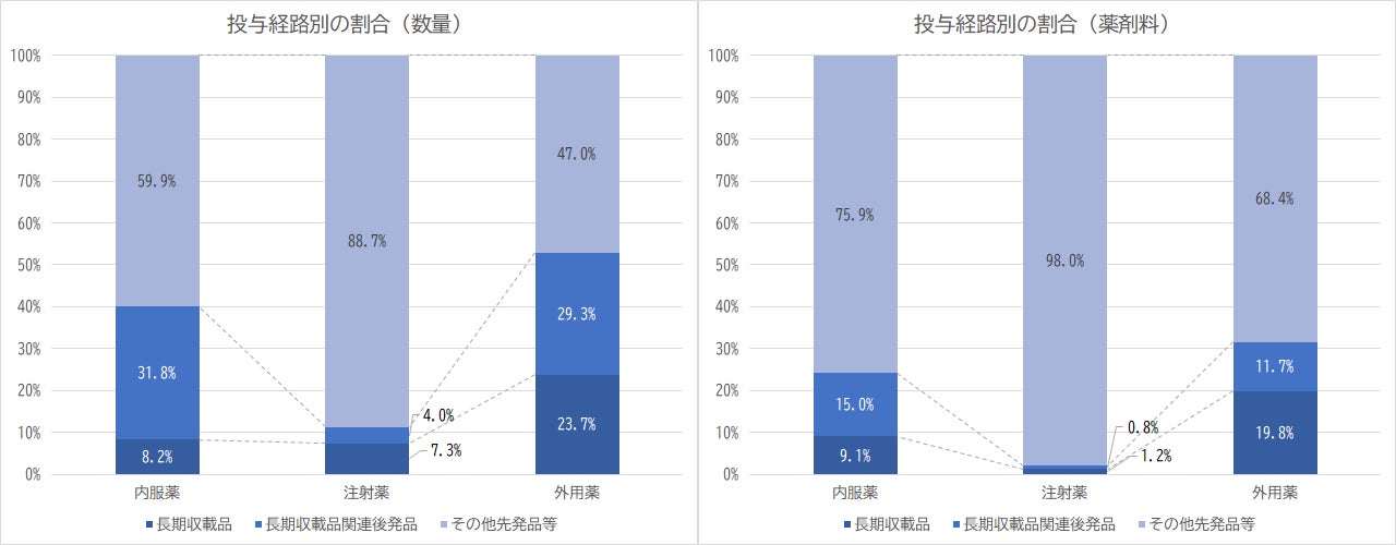 また、投与経路別に確認したところ注射薬は割合が小さく、外用薬において長期収載品が多く使用されていることが分かりました。(図3)