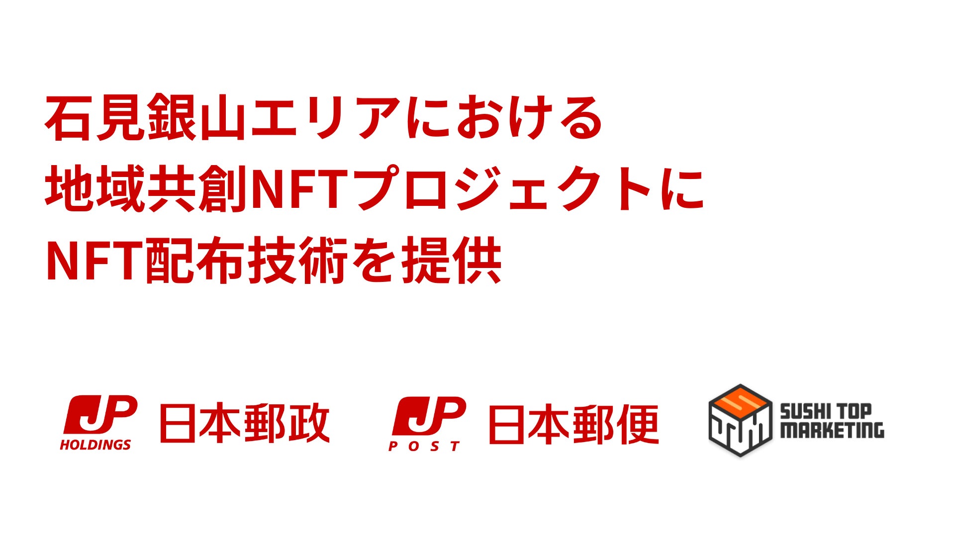 SUSHI TOP MARKETING株式会社(東京都千代田区、代表取締役CEO:徳永大輔、以下「当社」)は、日本郵政株式会社(東京都千代田区、取締役兼代表執行役社長:増田寬也、以下「日本郵政」)、日本郵便株式会社(東京都千代田区、代表取締役社長兼執行役員社長:千田哲也、以下「日本郵便」)、一般社団法人石見銀山みらいコンソーシアム(島根県大田市、代表理事:松場 大吉、以下「みらいコンソ」)および島根県大田市(市長:楫野弘和、以下「大田市」)が石見銀山エリアにおいて実施する、NFTを活用した観光体験の向上や来訪誘致、地域と関わり続けられる仕組みの構築に向けた実証実験に技術提供いたします。