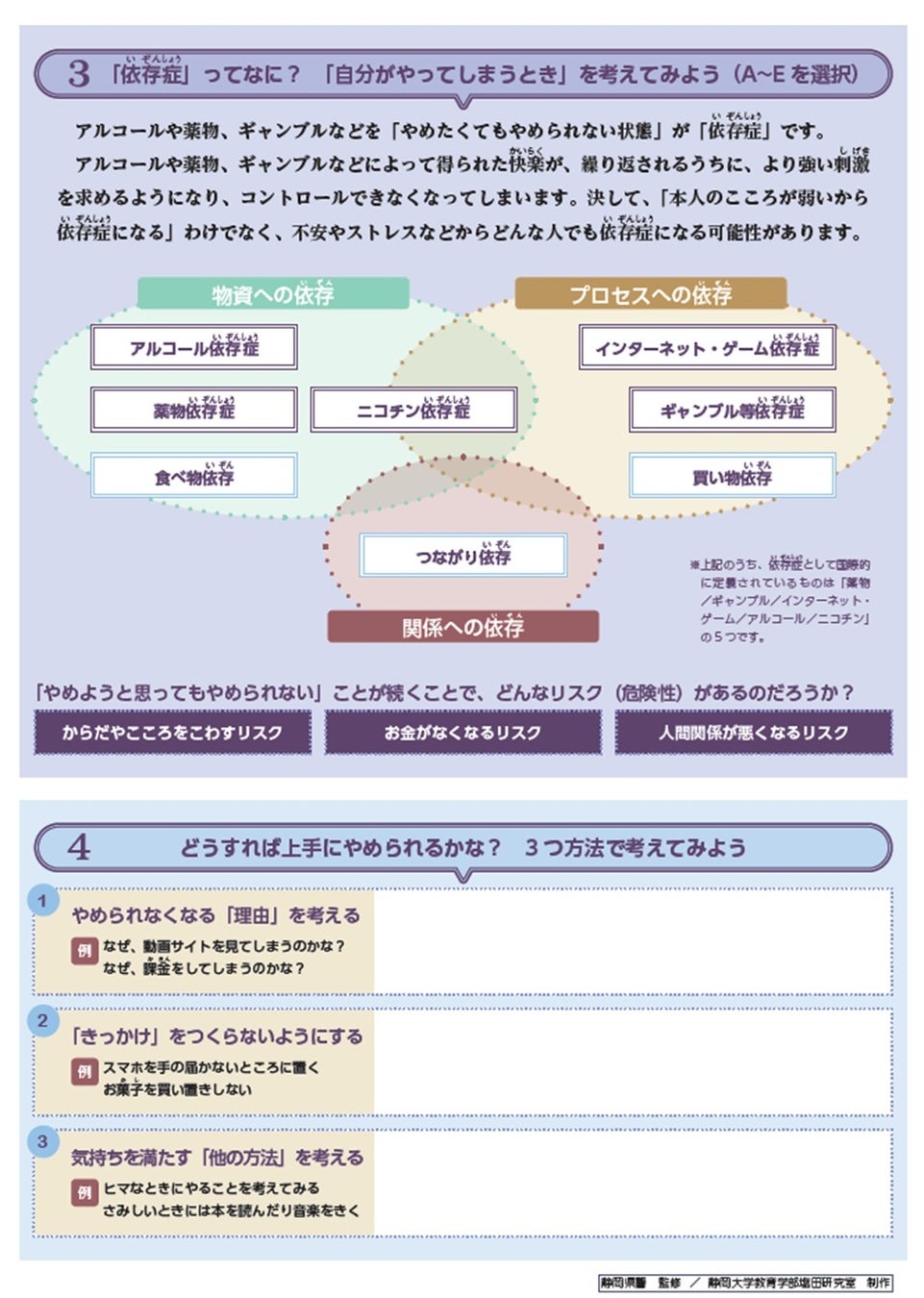 国立大学法人静岡大学教育学部塩田研究室(准教授:塩田真吾)は、静岡県警人身安全少年課の監修のもと、「いろいろな依存について考えてみよう」と題した依存症予防教材を開発し、11月より無料で公開しております。
