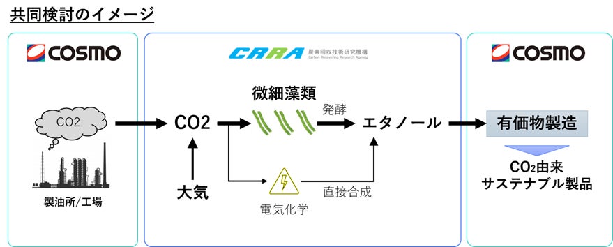 両社は今回の共同検討を通じて、コスモエネルギーグループの製油所等、または大気中から回収したCO2由来のサステナブル製品の実用化を目指してまいります。また、CRRAが開発を進めている電気化学手法を用いて製造したエタノールについても利活用を検討してまいります。