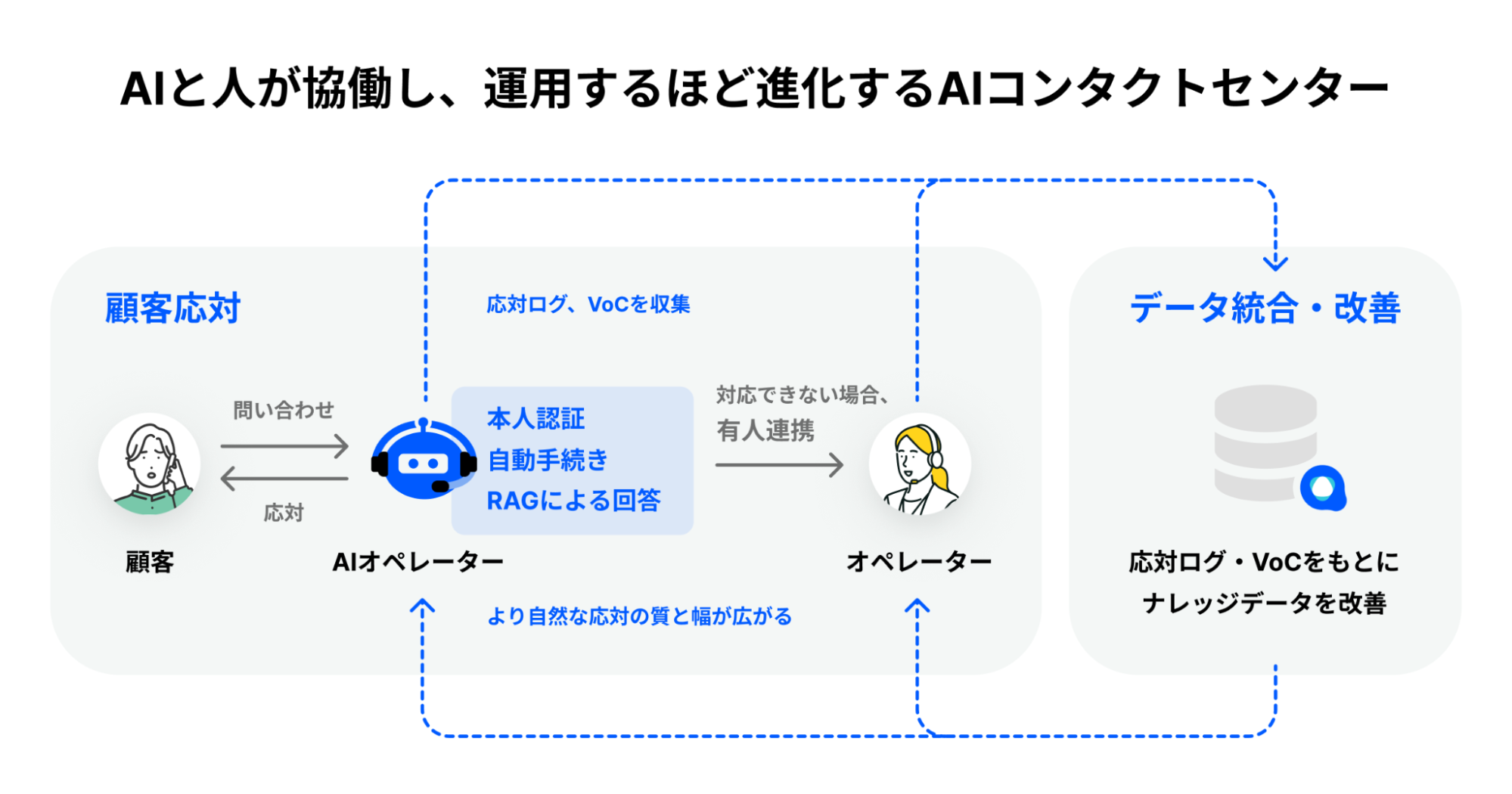 AIオペレーターが一次応対から解決までを担い、ナレッジ統合基盤が応対ログやVoCを学習・統合することで、運用するほど精度が向上していく自己進化型の運営モデルを実現します。