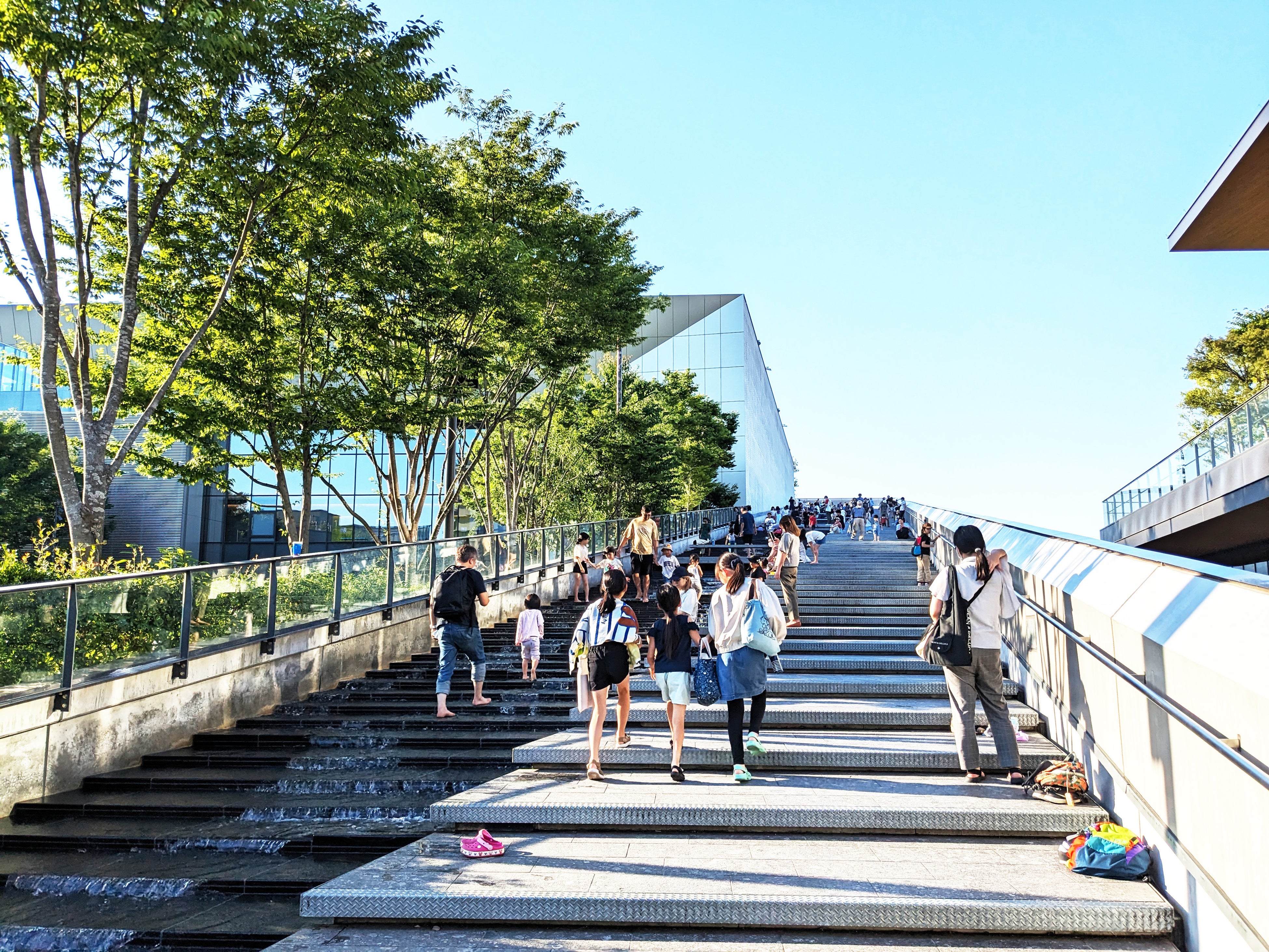 GREEN SPRINGSの目玉施設である全長約120mの水の流れる階段「カスケード」は足をつけて水遊びができます。川のせせらぎのような水の流れる音を聞きながらのんびりと過ごすも良し、大人もこどももはしゃぐも良し。涼みながら花火の時間までお過ごしいただけます。夜のライトアップもフォトスポットに。