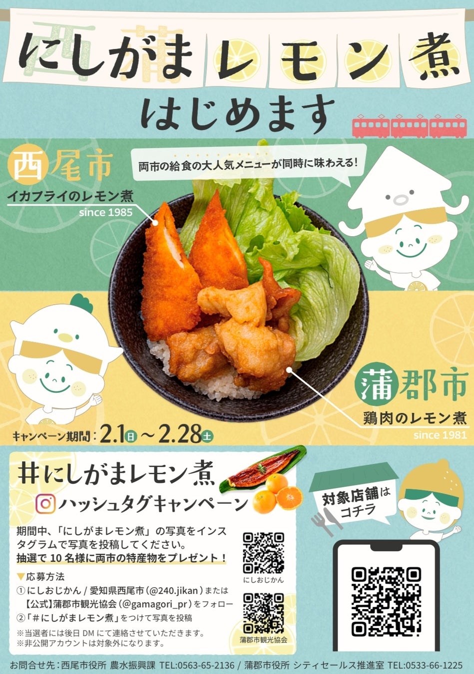 愛知県西尾市と蒲郡市の学校給食の人気ナンバー1メニュー、「イカフライのレモン煮」(西尾市)と「揚げ若鶏のレモン煮」(蒲郡市)がコラボメニュー「にしがまレモン煮」となって両市の飲食店で販売されます!