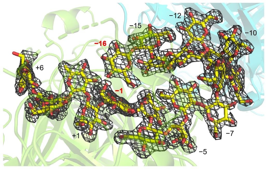 続いて、この前例のない反応のメカニズムを解明するためにXccOpgDの酵素-基質複合体の構造をX線結晶構造解析により決定しました。その結果、22個のグルコース単位からなる直鎖状β-1,2-glucanの電子密度(*2)が触媒クレフトにおいてはっきりと観察され、さらに、16個のグルコース単位がちょうど環状になるように配置されていました(図5の−1から−16のグルコース単位)。