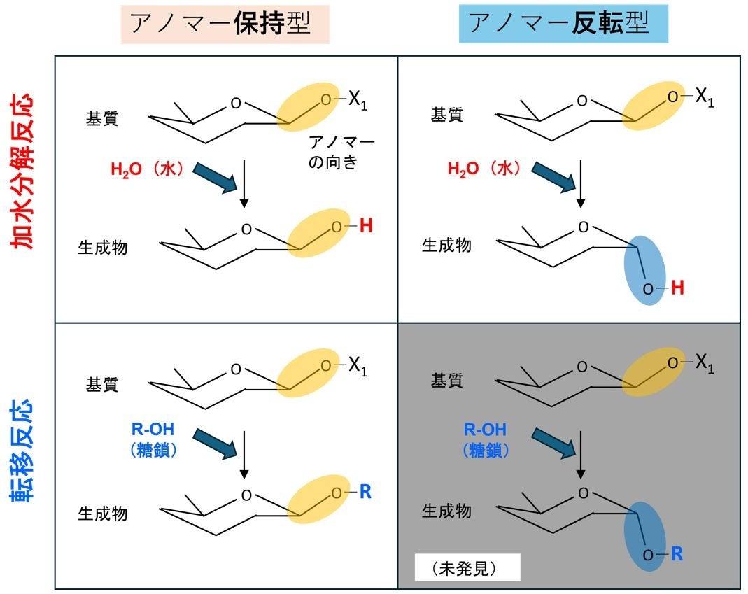 糖質加水分解酵素群は、反応前後でアノマー型が保持されるか反転するかで、アノマー保持型とアノマー反転型に大別されます(*1)。また、この酵素群は基質に水がアタックするか、糖鎖がアタックするかで加水分解反応と糖転移反応に分類され、理論的には4種類の反応に分けられます(図2)。糖転移反応は生体内で重要な役割を果たす反応の一つであり、糖鎖合成のツールとしても利用価値の高い反応ですが、アノマー保持型でしか見つかっていませんでした。