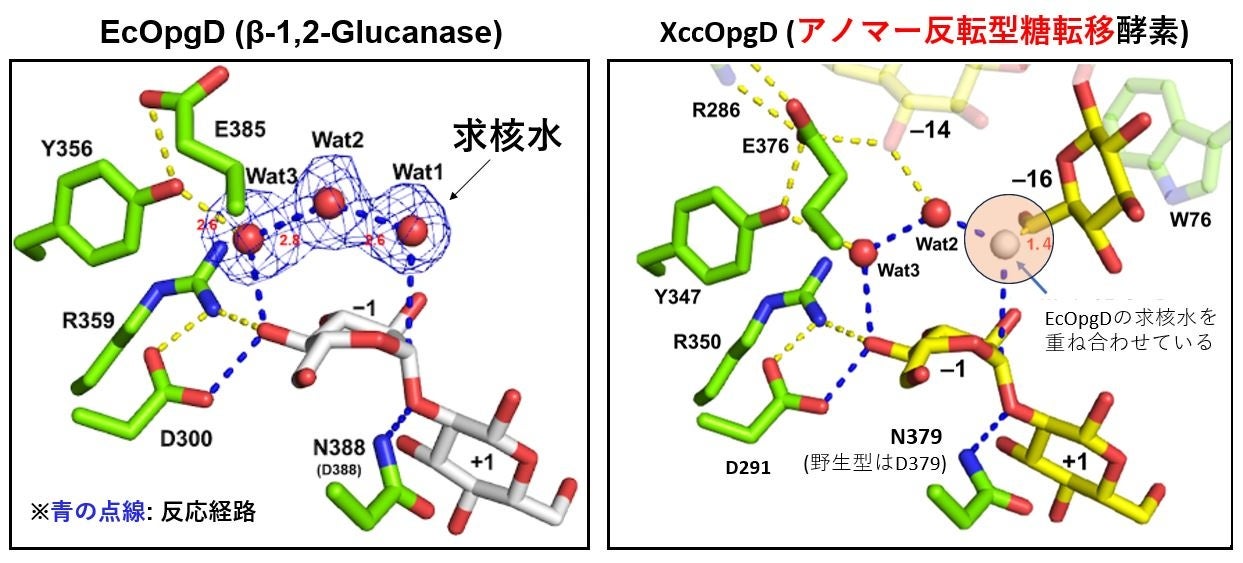 アノマー反転型の加水分解酵素である大腸菌由来EcOpgDとXccOpgDの構造を比較すると、EcOpgDでは基質に求核攻撃を行う水分子がはっきりと観察されるため、加水分解反応に適した環境になっていることが分かるのに対し、XccOpgDではそれに対応する水分子(求核水)が観察されませんでした(図6)。その代わりにXccOpgDでは、求核攻撃に適した位置の近傍に、基質である直鎖状β-1,2-グルカンの還元末端のグルコース単位の6位ヒドロキシ基が存在していることが分かりました。これは、この位置で酵素反応によりα-1,6-グリコシド結合が生じることを示しており、XccOpgDの新規な糖転移反応のメカニズムが立体構造により明確に証明されたと言えます。