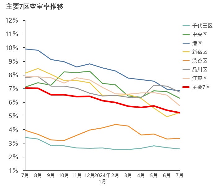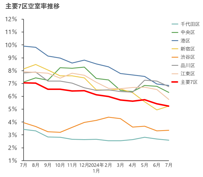 主要7区の空室率について、中央区・品川区・江東区で回復、新宿区で上昇、千代田区・港区・渋谷区で横這いとなった。豊洲エリアにおいて空室の消化が進んだことが影響し、江東区では前月比で 0.77pt回復した 。都心5区・7区の空室率は共に回復傾向が継続しており、都心5区においては、5.01%まで回復している。