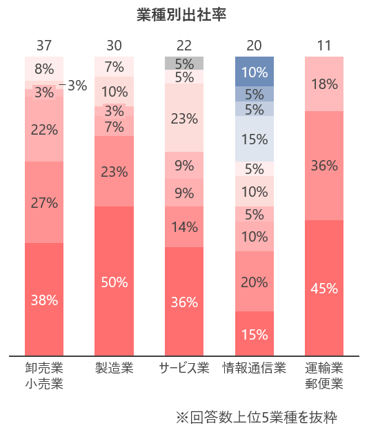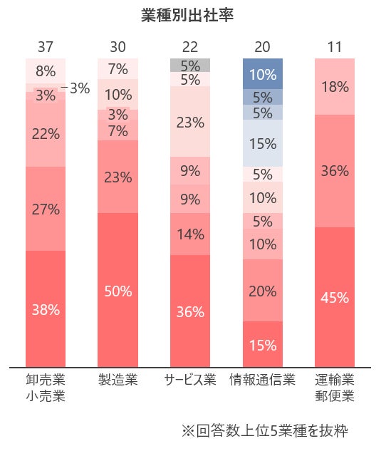 当社が実施した「企業の不動産ニーズに関するアンケート」(本年6月実施)によるとオフィス出社率について、「100%」との回答が全体の37%と最も多かった。出社率80%以上との回答が全体の70%を占め、多くの企業で出社回帰が進んでいる状況が窺える。出社率が30%以下との回答は、全体の5%に留まった。業種別に見ると、情報通信業のみ「10%未満」との回答があった他、出社率30%以下との回答が35%と、他業種と比較しテレワーク等が浸透しているものと思われる。