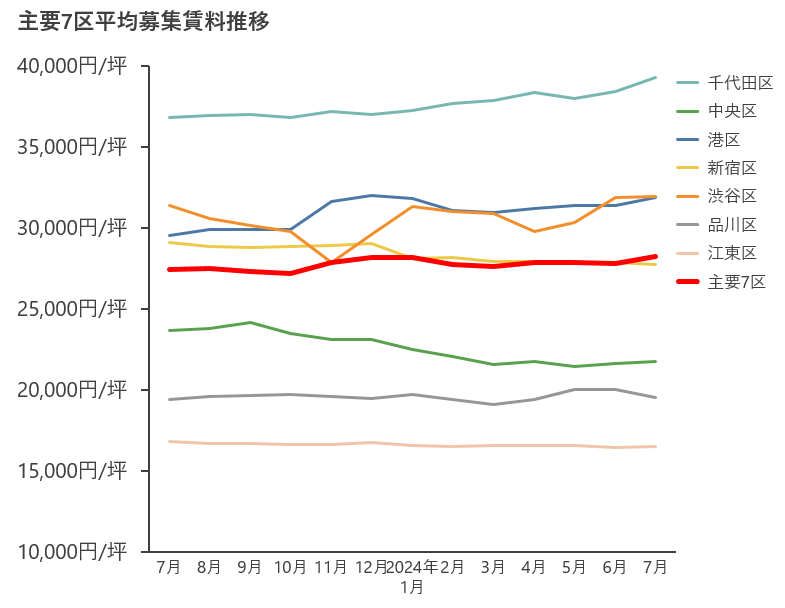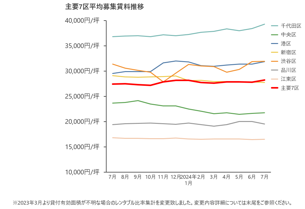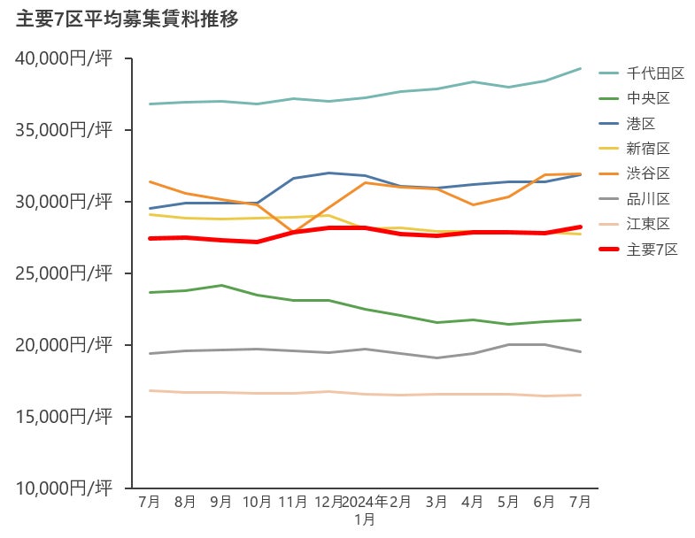 【2024年7月末時点の主要7区空室率・平均募集賃料の動向】
