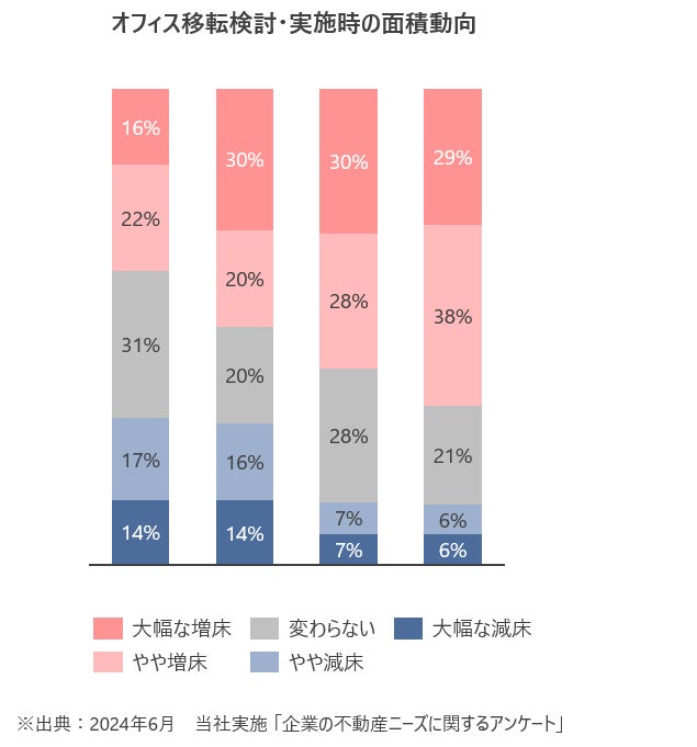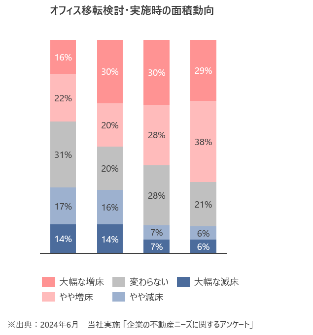 オフィス移転時の面積動向は、増床傾向となっており、「大幅な増床」、「やや増床」が全体の67%を占めた。「大幅な減床」、「やや減床」の割合は前回からあまり変化はなく、「変わらない」の割合が低下した。好調な企業業績や人員増加、出社回帰等の影響を受け、拡張移転がトレンドとなっている。