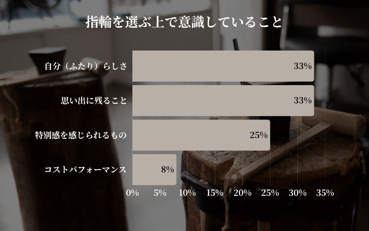 指輪選びにおいて最も強く意識されているのは、「自分(ふたり)らしさ」(33%)と「思い出に残ること」(33%)であり、感情的価値が非常に高い割合でトップを占めています。