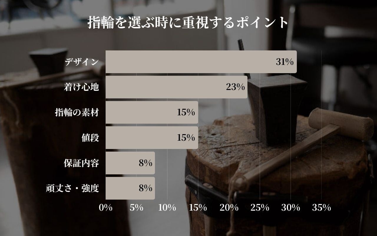 また、「指輪の素材」(15%)と「値段」(15%)が同率で続き、素材の選択(プラチナかゴールドかなど)や、予算とのバランスも重要な決定要因となっています。