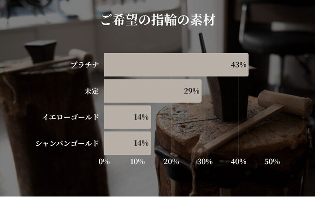 指輪の素材に関する回答では、「プラチナ」(43%)が最多となり、ブライダルジュエリーの定番素材としての根強い人気を再確認できます。特別な節目にふさわしい耐久性と高級感を重視する傾向が読み取れます。