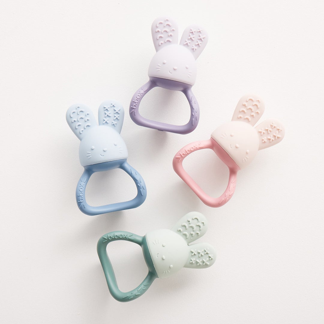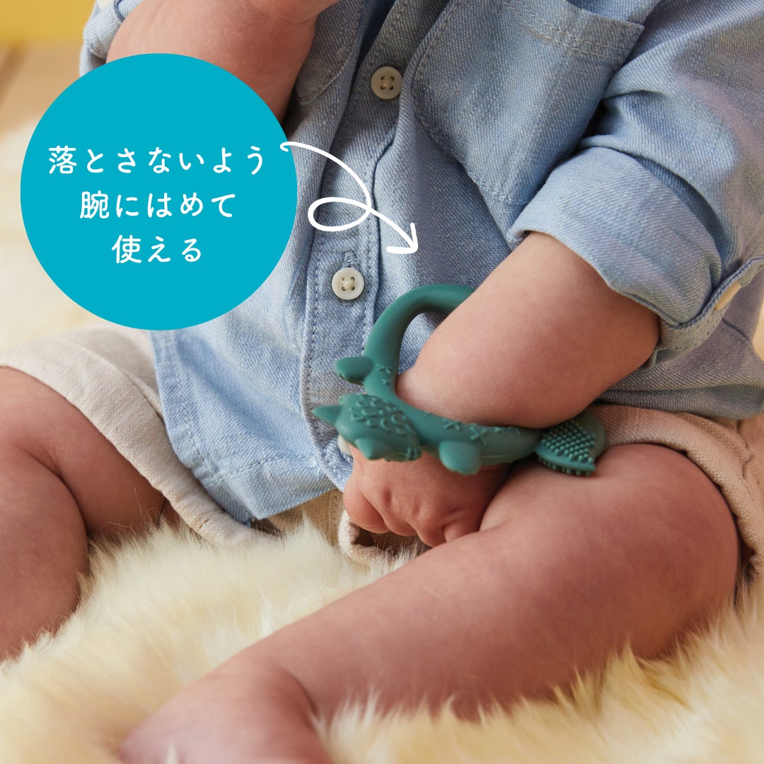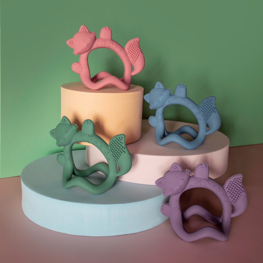 かわいいキツネの形のリストティーサーは手首にはめることのできるブレスレット型の歯固め。表面のテクスチャーは歯茎の痛みをマッサージし、好奇心を刺激するのに役立ちます。