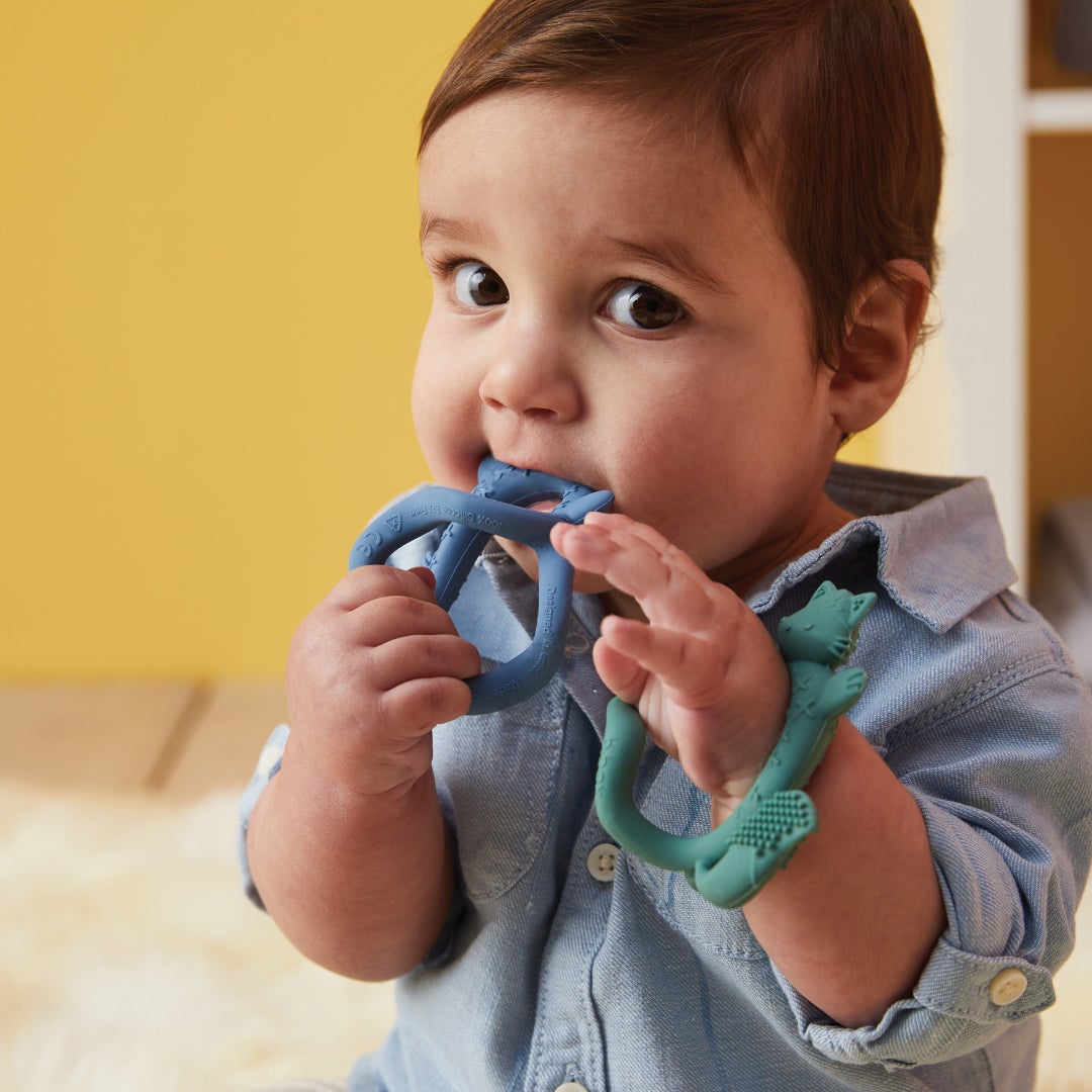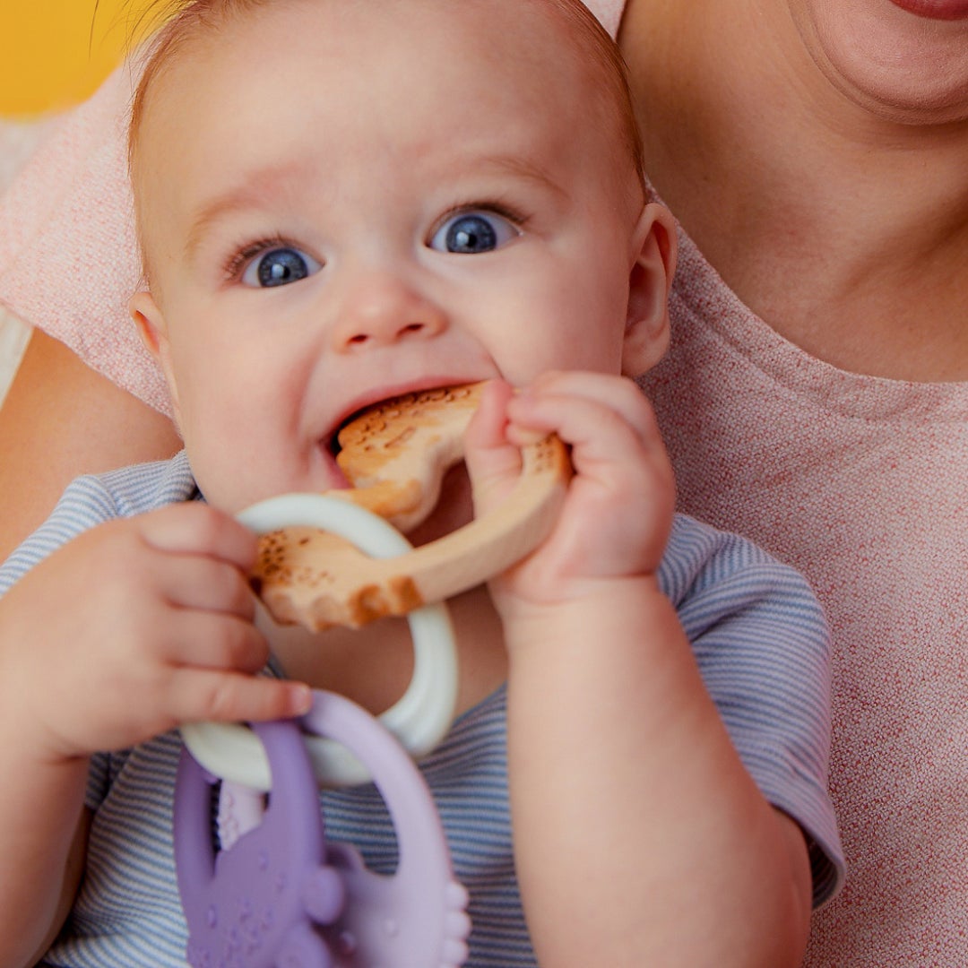 個人差はありますがおよそ生後6ヶ月~9ヶ月頃から下の前歯、上の前歯と徐々に歯が生えはじめていきます。リストティーサーは部分によって形やテクスチャーが異なるので段階的に歯茎のむずがゆさをサポートできます。