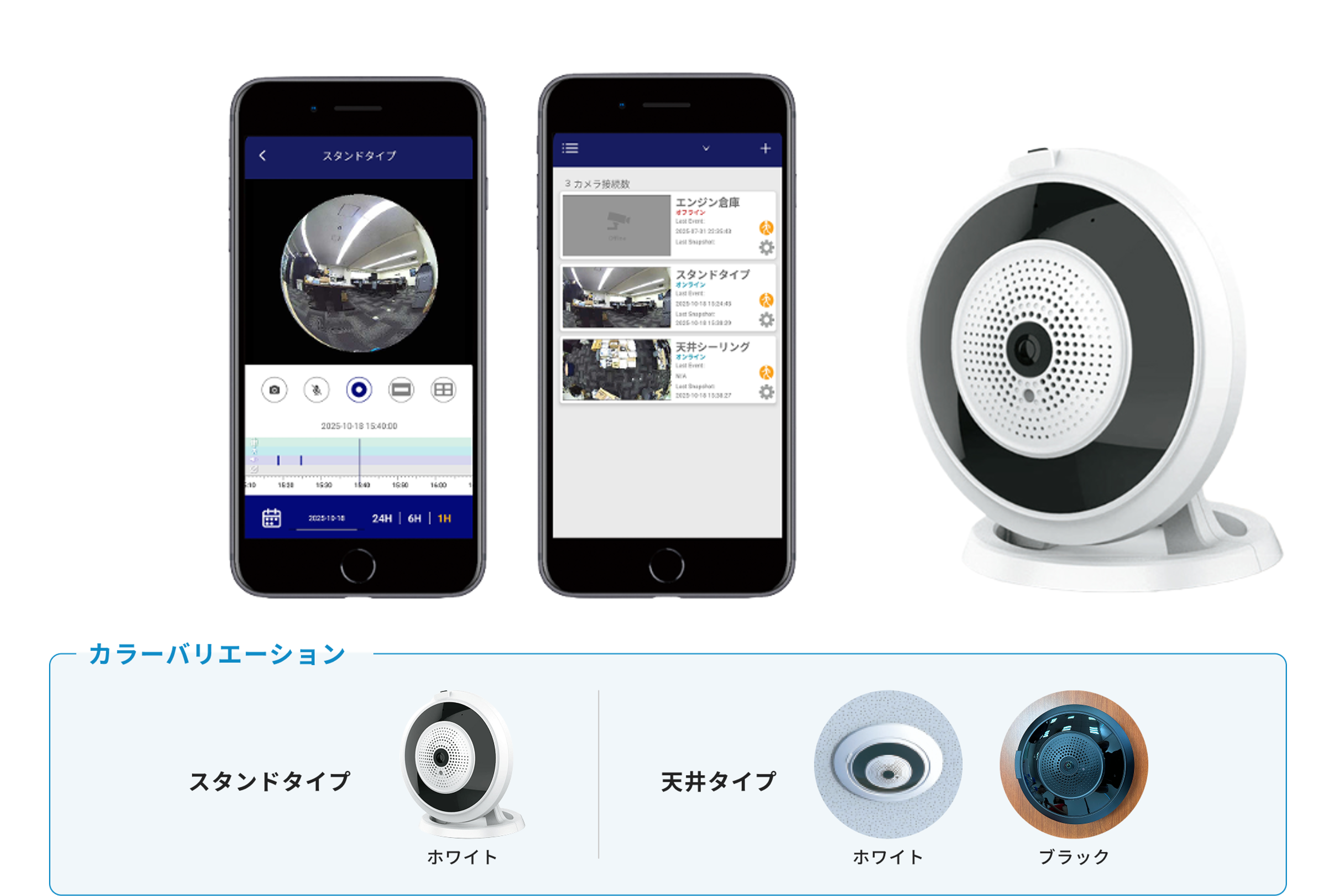 従来は別々の契約と設置工事が必要だった2つの機器を1台にまとめることで、ランニングコストを大幅に抑えることができます 。天井埋め込みタイプであれば、目立たないデザインで店舗やオフィスの景観を損なわず、死角のない360°全方位監視が可能です 。また、スタンドタイプもラインナップしており、設置場所を選びません。