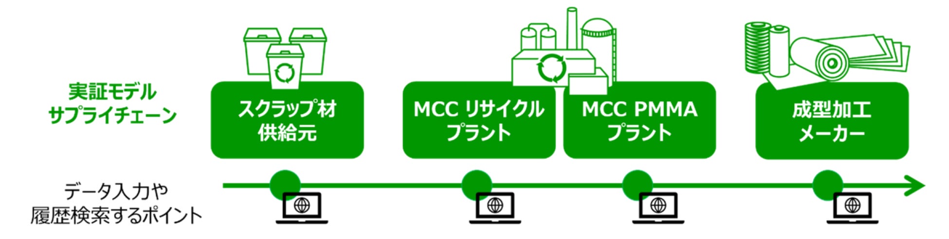 本プロジェクトでは、各種の評価技術の確立とそこから得られた情報を活用するデジタル基盤構築の両面から、重要課題としてELV(End-of-Life Vehicles:ELV)規則案対応のための自動車部品用途プラスチック再生材の高品質、安定供給が可能なリサイクルシステムの構築に取り組んでおり、さらに、今後そのノウハウを家電等の他分野へも展開することで相乗効果を図ることを狙っています。今回、MCCが事業化を目指しているアクリル樹脂のケミカルリサイクルのサプライチェーンを想定し、ブロックチェーンを用いた透明性・信頼性の高いサプライチェーン構築に向けたトレーサビリティシステムの実証試験を実施しました。