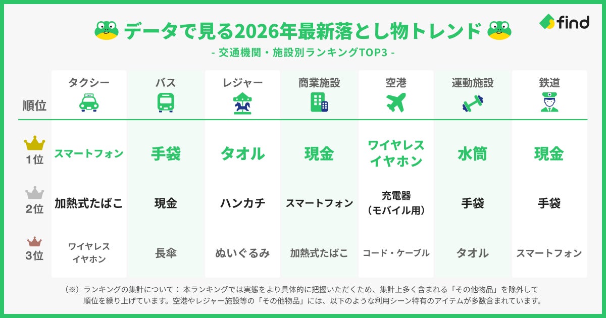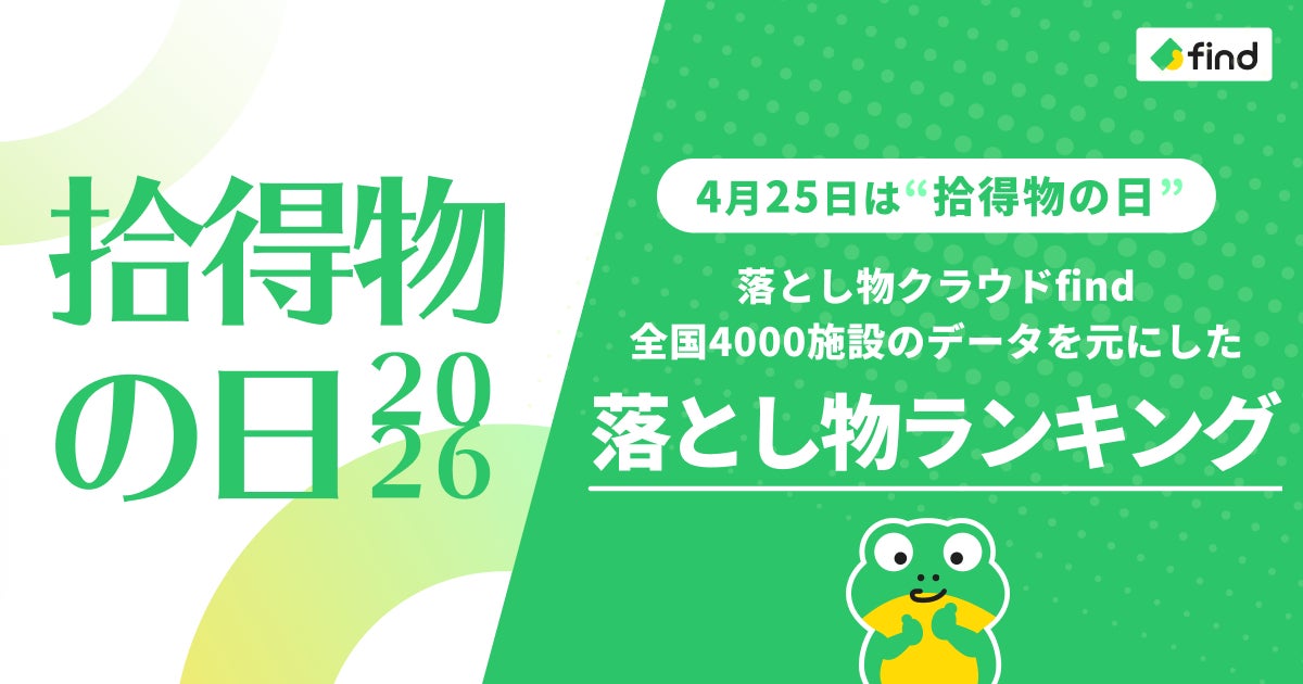 「落とし物が必ず見つかる世界」を目指し、「落とし物クラウドfind」を展開する株式会社find(所在地:東京都港区、代表取締役CEO:高島 彬)は、4月25日の「拾得物の日」を前に、全国4,000施設のデータを分析した施設別の落とし物ランキングを公開いたします。