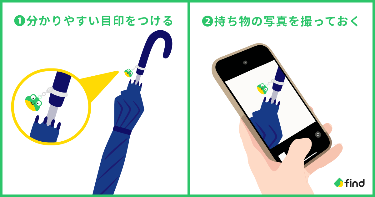 傘やワイヤレスイヤホンなどは、同じような落とし物が多く届けられます。目印をつけることで、ご自身の物と特定がしやすくなります。