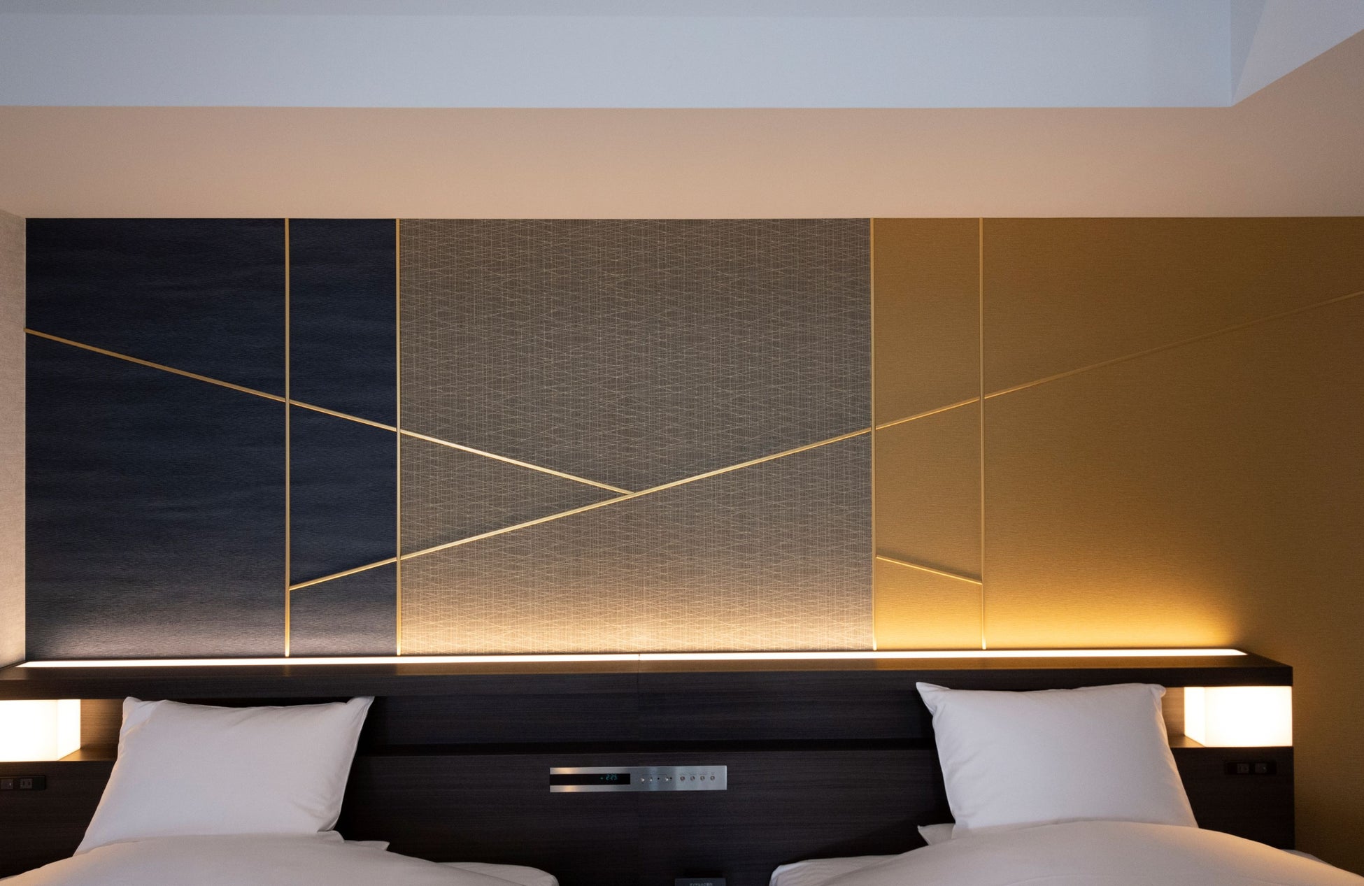 客室は「武家屋敷」をコンセプトに、シンプルで機能的なデザインにまとめ、加賀五彩の華やかさをプラス。伝統的な色彩が奥ゆかしく、ゆったりとしたお時間をお過ごしいただけます。