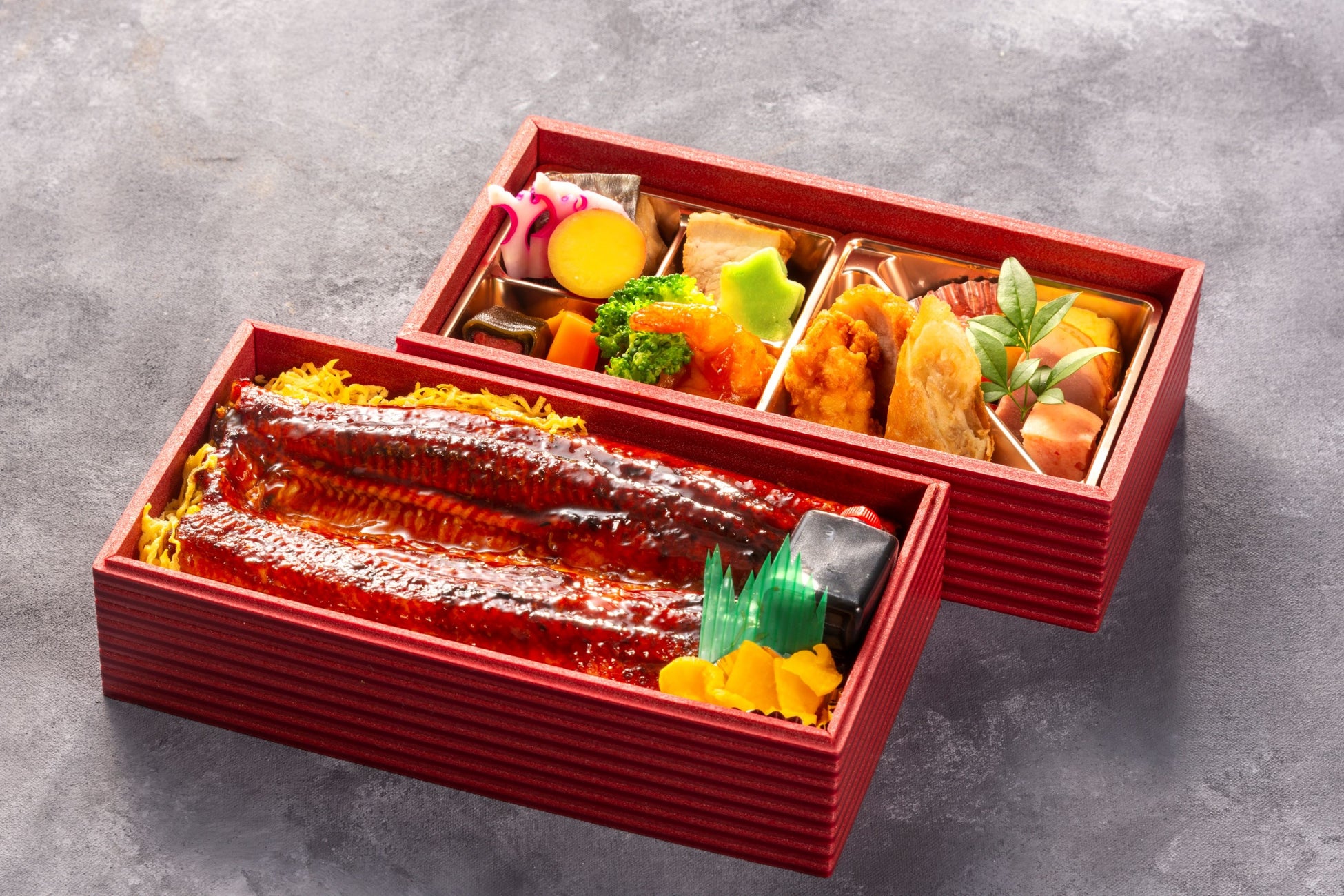 上段には彩り豊かな四季折々の食材を詰め込み、下段には柔らかくふっくらジューシーに仕上げたうな重を。
