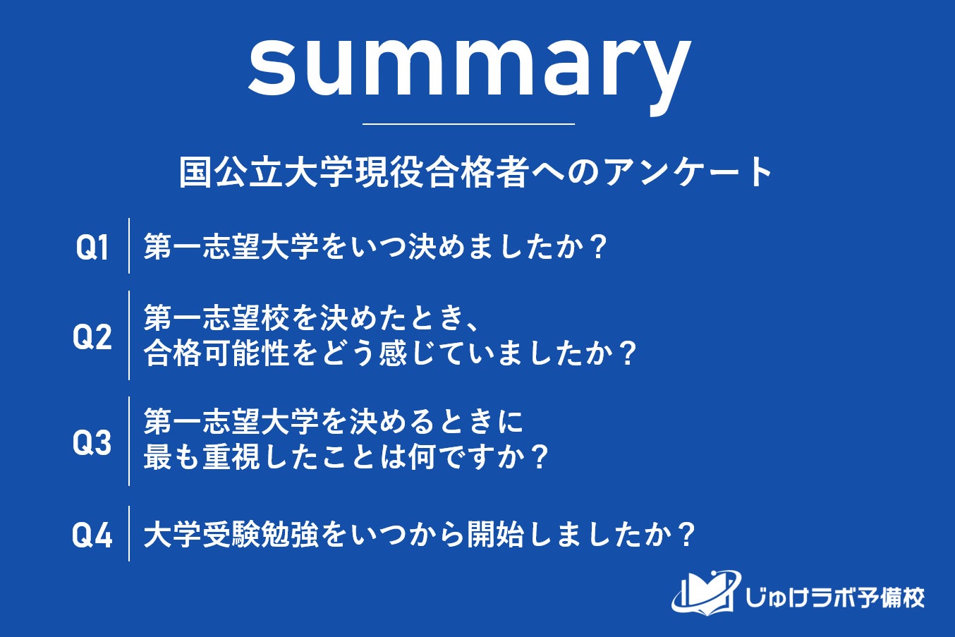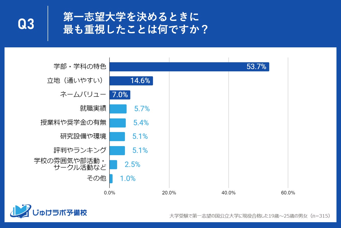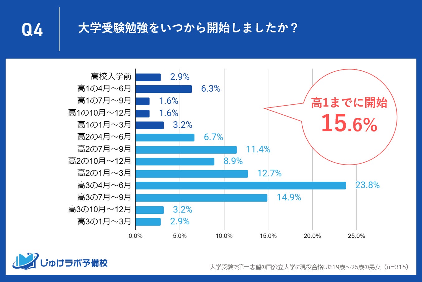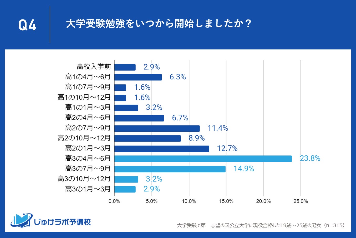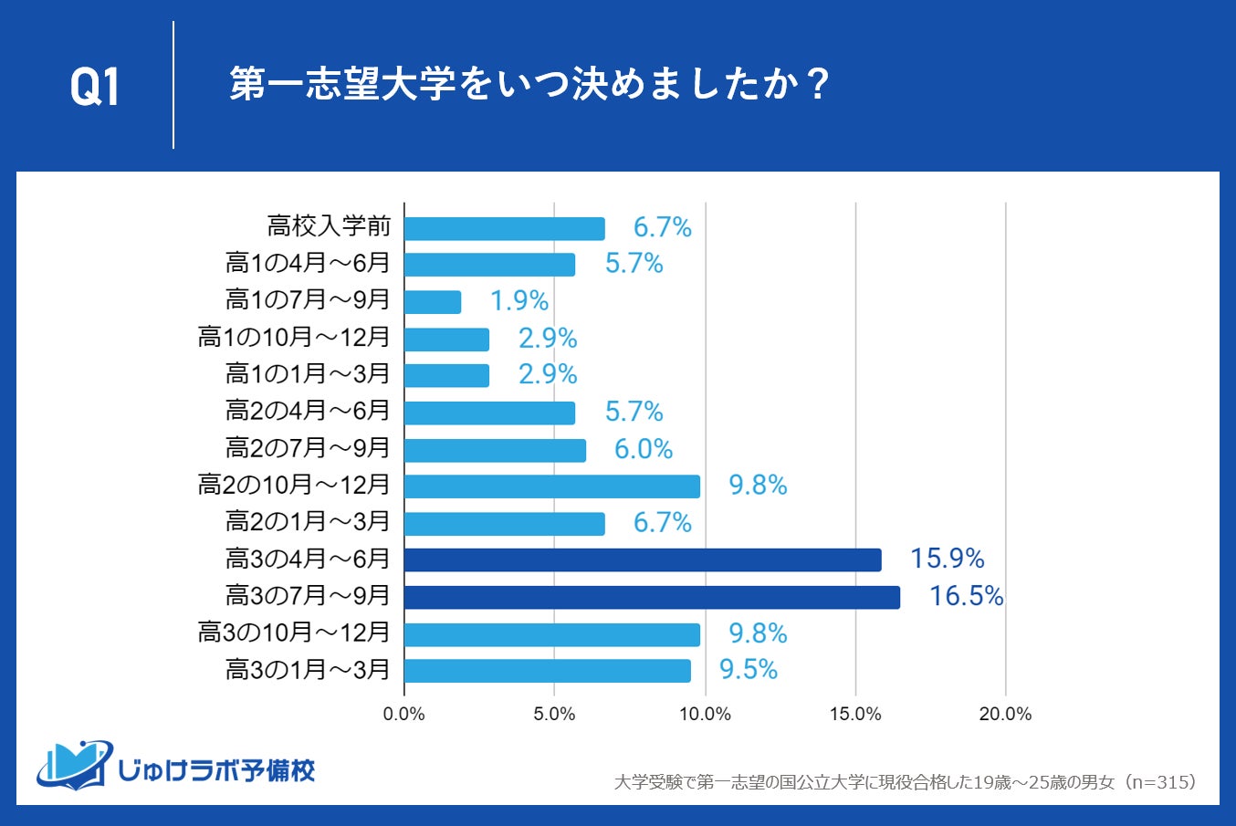 じゅけラボ予備校(所在地:大阪市北区、代表取締役:後藤智則)は、第一志望の国公立大学に現役合格した315名を対象に、志望校を決定した時期や受験勉強の開始時期に関する調査を実施しました。