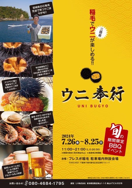 千葉:フレスポ稲毛で !三陸産▶▷殻付きウニ◁◀を炭火焼き!7/26-8/25の限定出店!激レア旬のウニを炭火で楽しむ『ウニ奉行 フレスポ稲毛店』
