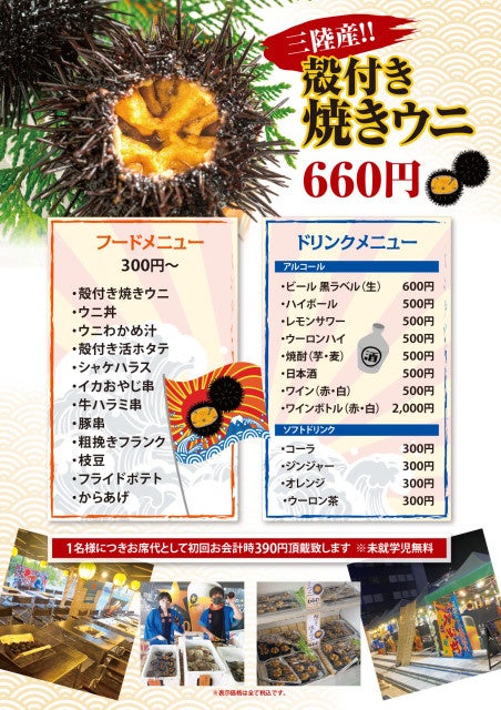 焼きウニの他にも、ウニ丼・ウニわかめ汁・活ホタテ・ほっけ・牛串・豚串など、厳選された食材と、ドリンクも豊富に取り揃えており、高品質な備長炭の炭火を囲んで楽しむことが出来る。