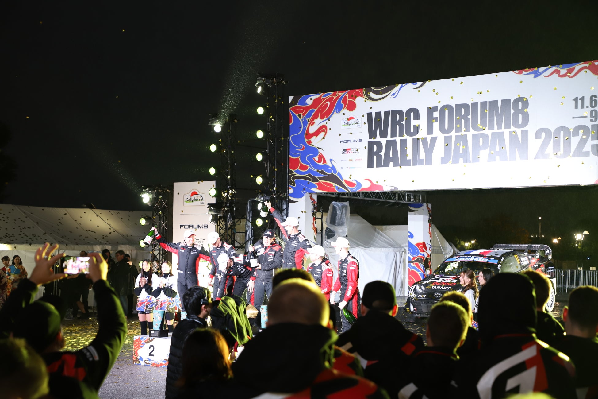 競技終了後、豊田スタジアムでラリージャパン2025のフィナーレを飾るセレモニーと表彰式が行われ、今大会の表彰台を独占した「TOYOTA GAZOO Racing World Rally Team」の選手らによるシャンパンファイトが始まると、会場では大きな拍手や歓声が上がり、紙吹雪やカメラのフラッシュなどと相まって大変な盛り上がりを見せていました。