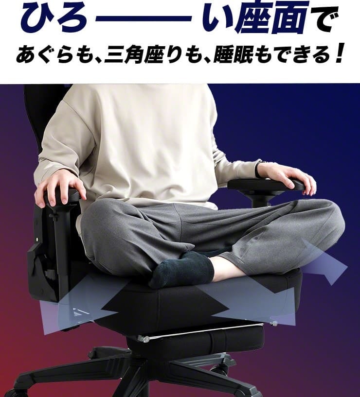 広い座面: あぐらもかける広々とした座面で、ゆったりと座ることが可能。
