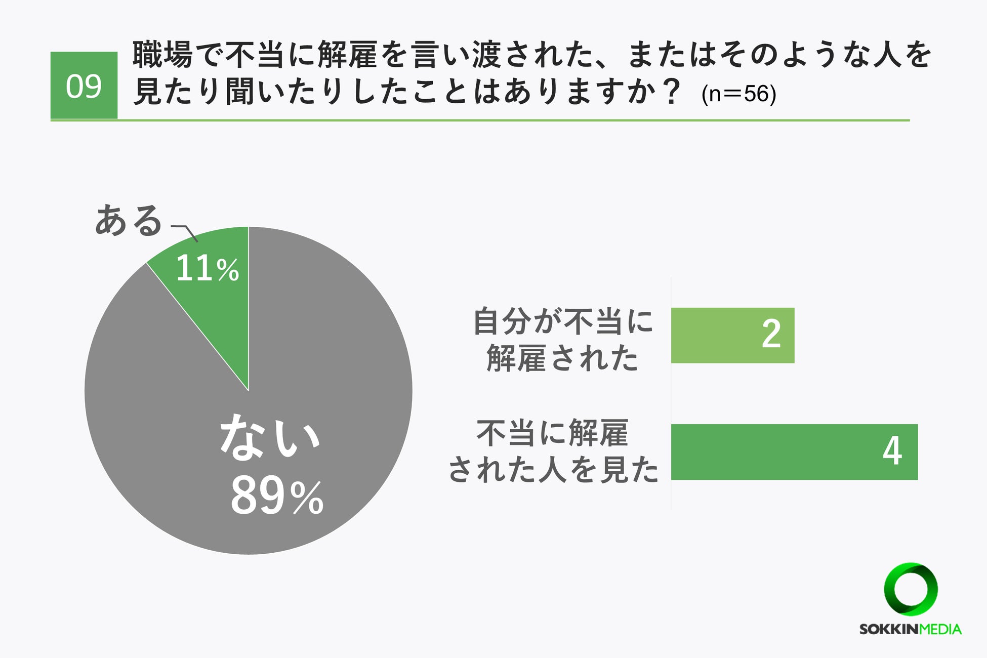 「Q9. 職場で不当に解雇を言い渡された、またはそのような人を見たり聞いたりしたことはありますか?」という問いに対して、11%の方が「ある」と回答しました。その内訳として、「不当に解雇された人を見た」方が4人、「自分が不当に解雇された」という方が2人という結果になりました。