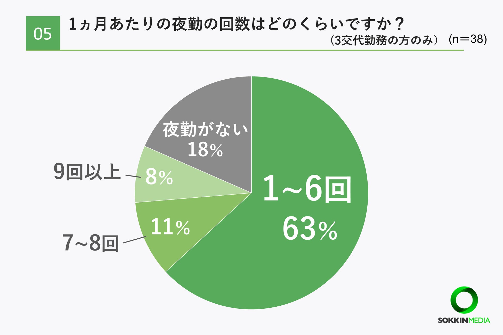 「Q5. 1ヶ月あたりの夜勤の回数はどのくらいですか?(3交代勤務の方のみ回答)」という問いに対して、「1~6回」と回答した方が最も多く63%という結果になりました。