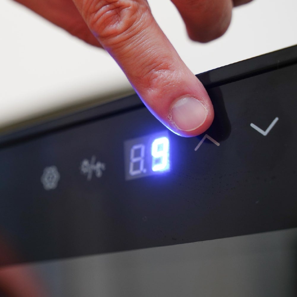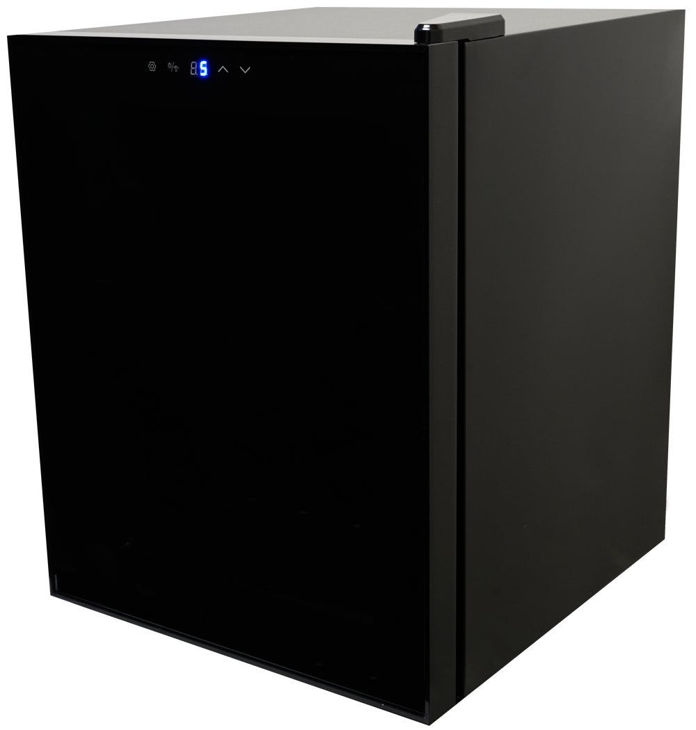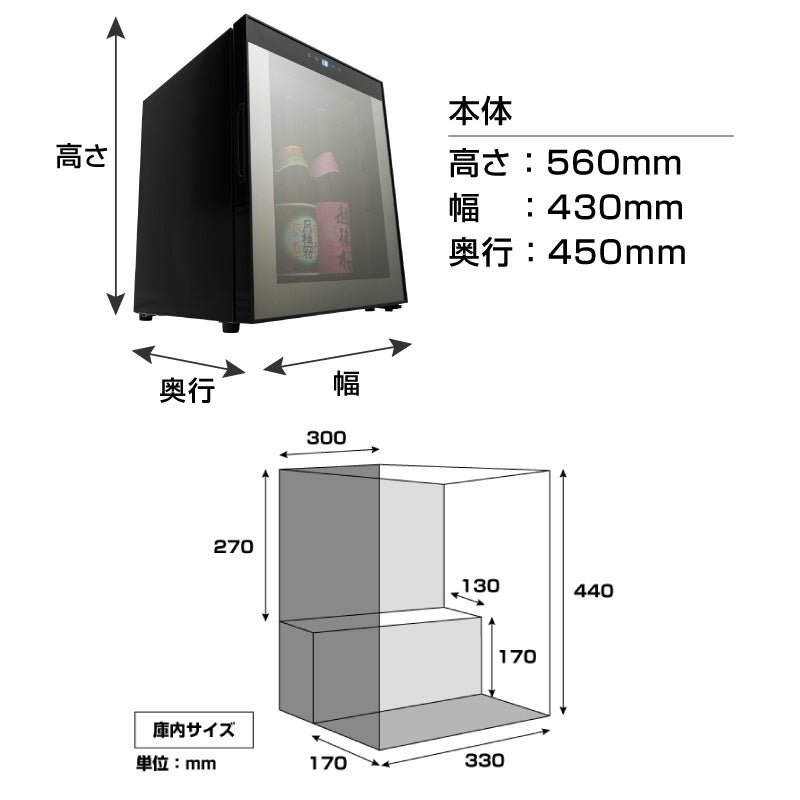 サイズは幅430×奥行き450×高さ560mm。一升瓶を立てたまま5本収納可能。家庭用冷蔵庫と同じコンプレッサー方式を採用し、しっかりと冷やすことができます。庫内に搭載されたファンにより冷気を循環させます。フロントパネル上部のタッチパネルで温度設定は3~18℃まで1℃単位で設定が可能。紫外線カットガラスパネルを採用し、中に入れた銘柄を外から見ることが可能。LED灯を備え、パネルをタッチしLED灯のオンオフが可能。お酒をほんのりと照らせます。付属のラックをセットすれば、ビールやワインを入れて冷やすこともできます。静音設計で寝室においても気になりません。