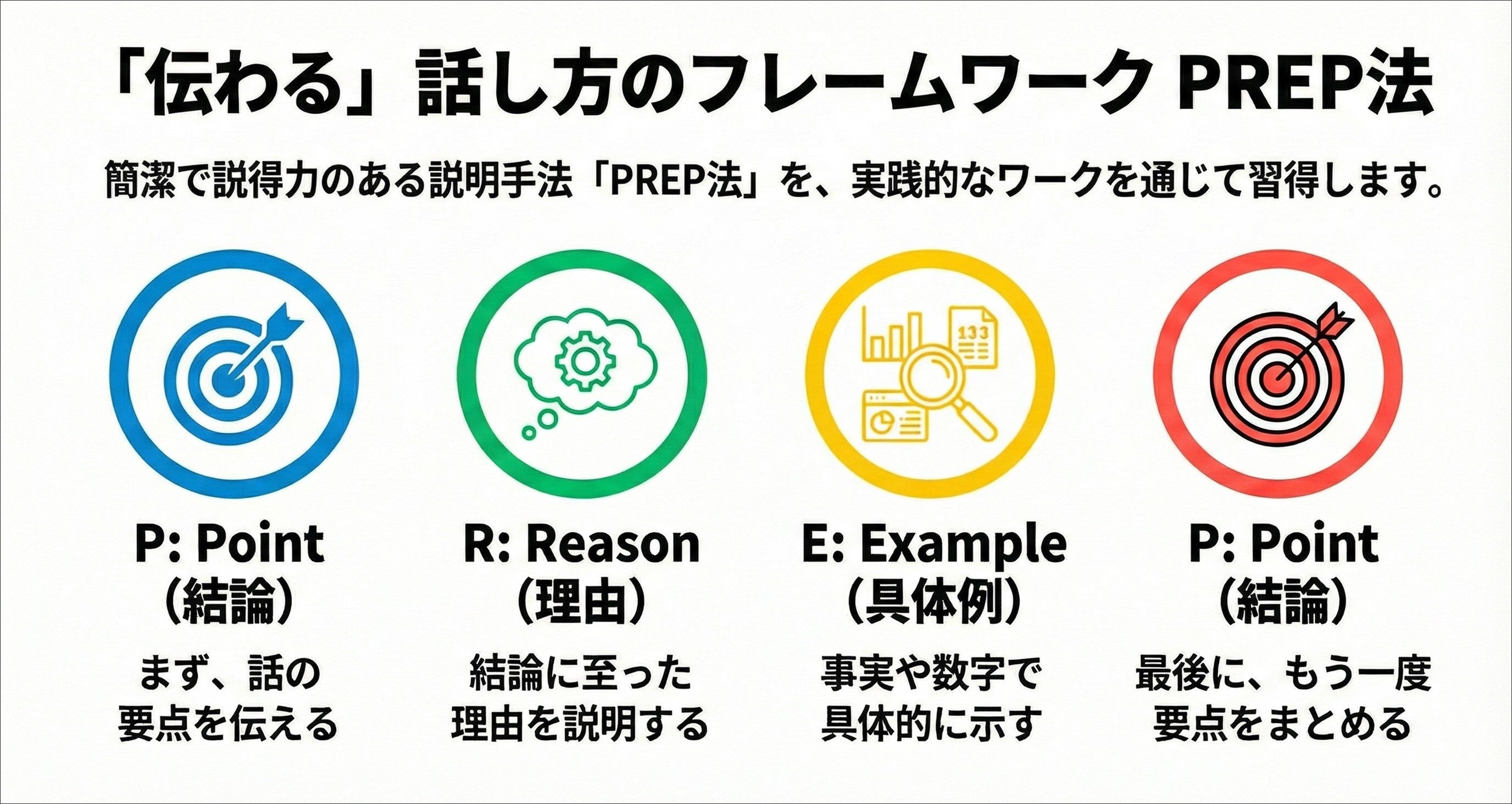 本研修は、PREP法の基本構造を定着させ、ビジネスの現場で即座に活用できる説明スキルを養成します。