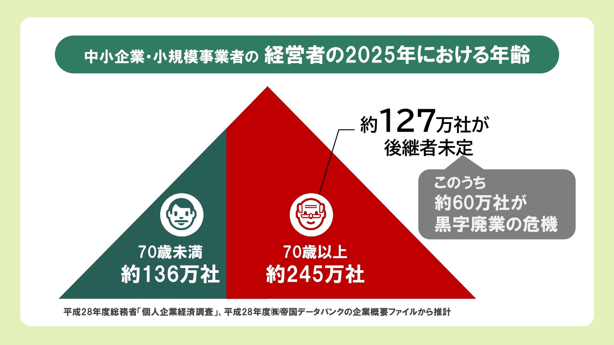 中小企業・小規模事業者の経営者は2025年に約245万社が70歳以上となり、そのうち127社が後継者未定というデータがあります。(※1)そのために黒字廃業の危機にあるのは約60万社にのぼり、多くの経営者が事業継承に頭を悩ませています。