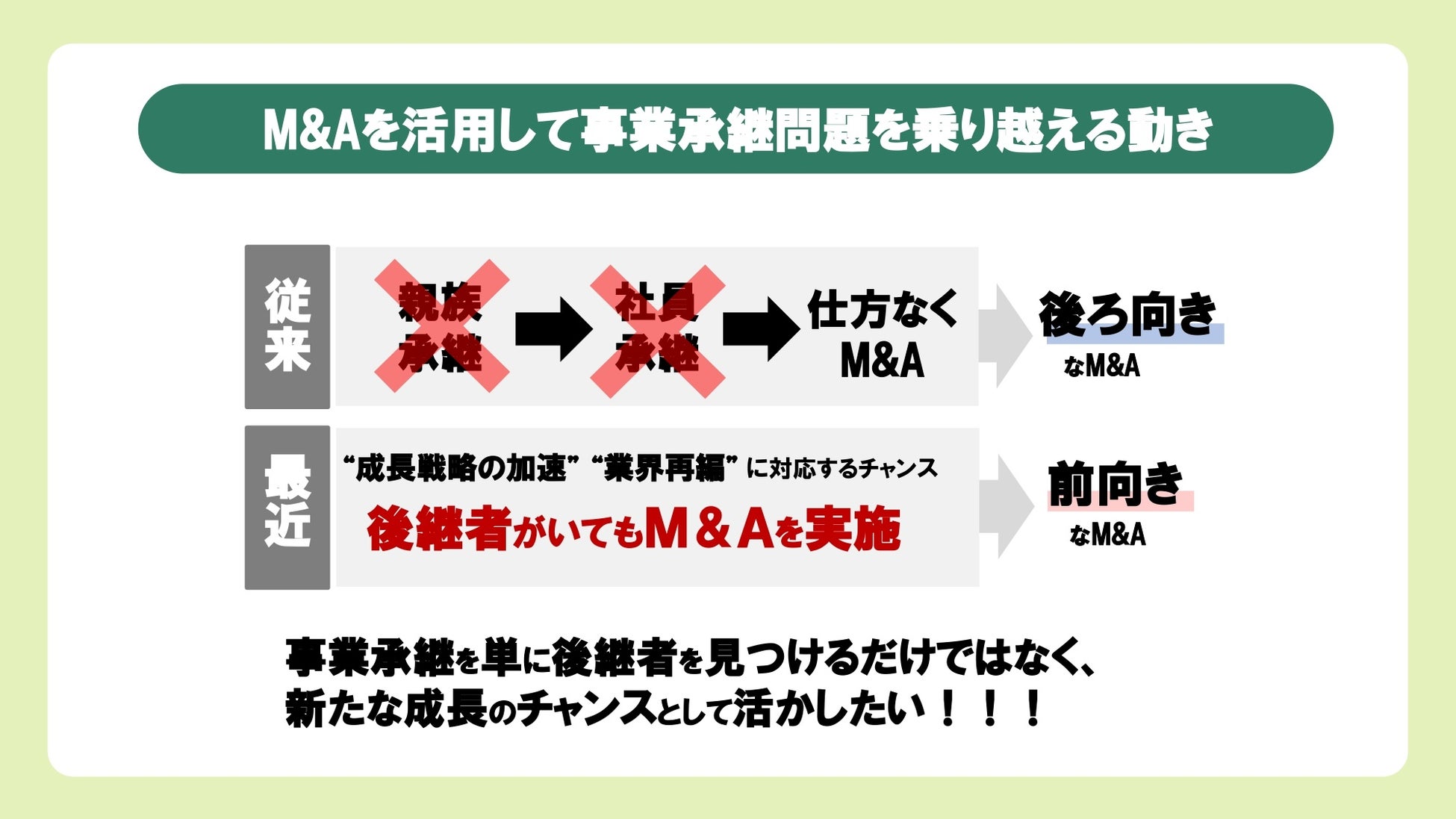 事業継承の選択肢は3つあり、①親族継承、②社員継承、③M&A。このM&Aこそが後継者問題を解決に導く手段であり、現在では約4割が第三者へのM&Aを選択しています。(※2)