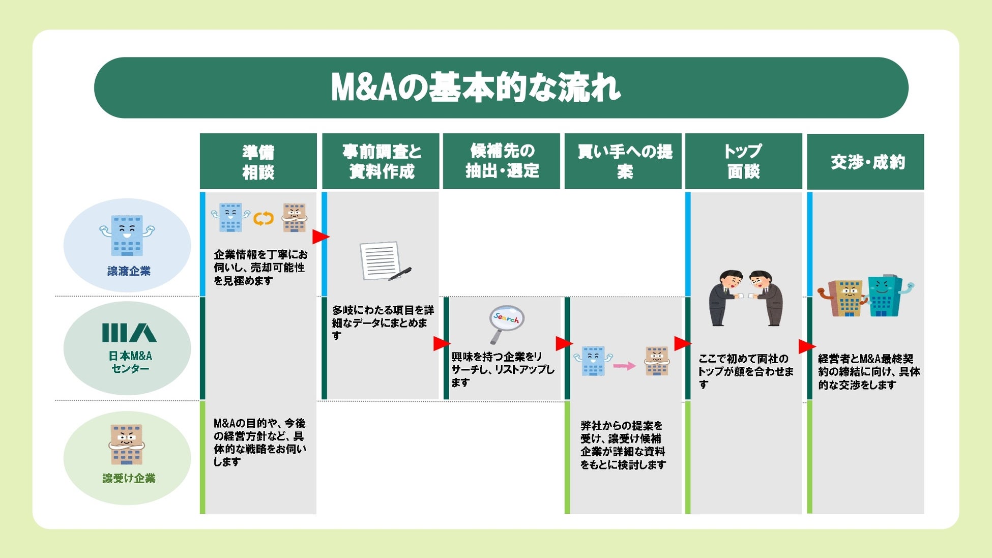 この4つにあります。M&Aのよく聞く誤解に「M&Aは合併である」というのがありますが、手続きは株式を譲渡するだけ=株主が変わるだけです。売り手も買い手も企業の存続と発展が目的のため、お互いにとって最も成長できる相手を選ぶことが重要です。