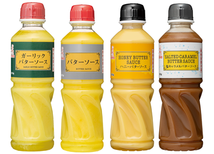 芳醇なバターの香りが特長で、使い勝手の良さや汎用性が支持され、売上が年々好調に推移している当社の人気シリーズです。『ガーリックバターソース』はメディアやSNSで度々取り上げられる主力商品。2023年2月に『ハニーバターソース』、2024年2月に『塩キャラメルバターソース』と甘系のラインナップを追加し、全4種類となりました。