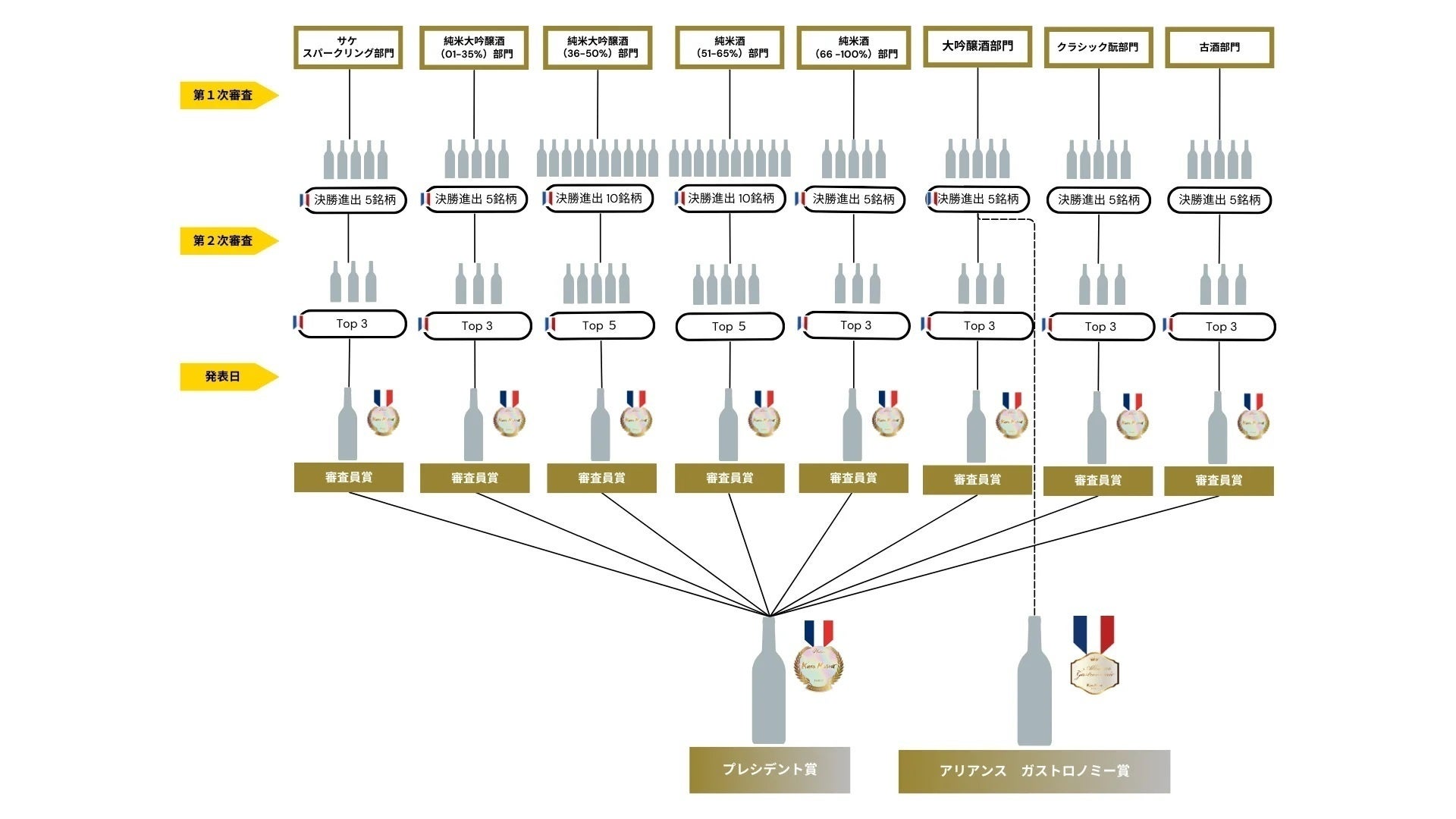 “Kura Master”は、2017年からフランスで開催されている、フランス国家が最高職人の資格を証明するMOF(Meilleur Ouvrier de France)の保有者をはじめ、フランスの一流ホテルのトップソムリエやバーマンなど、フランス人を中心としたヨーロッパの飲食業界のプロフェッショナルが審査員を務めるコンクールです。日本酒は8部門、計1083銘柄が審査されました。すべての出品酒はブラインドでテイスティングが行われます。評価方法は100点満点の加点法で、プラチナ賞は、100ポイントから93ポイント、金賞は、92ポイントから80ポイントまでとなります。