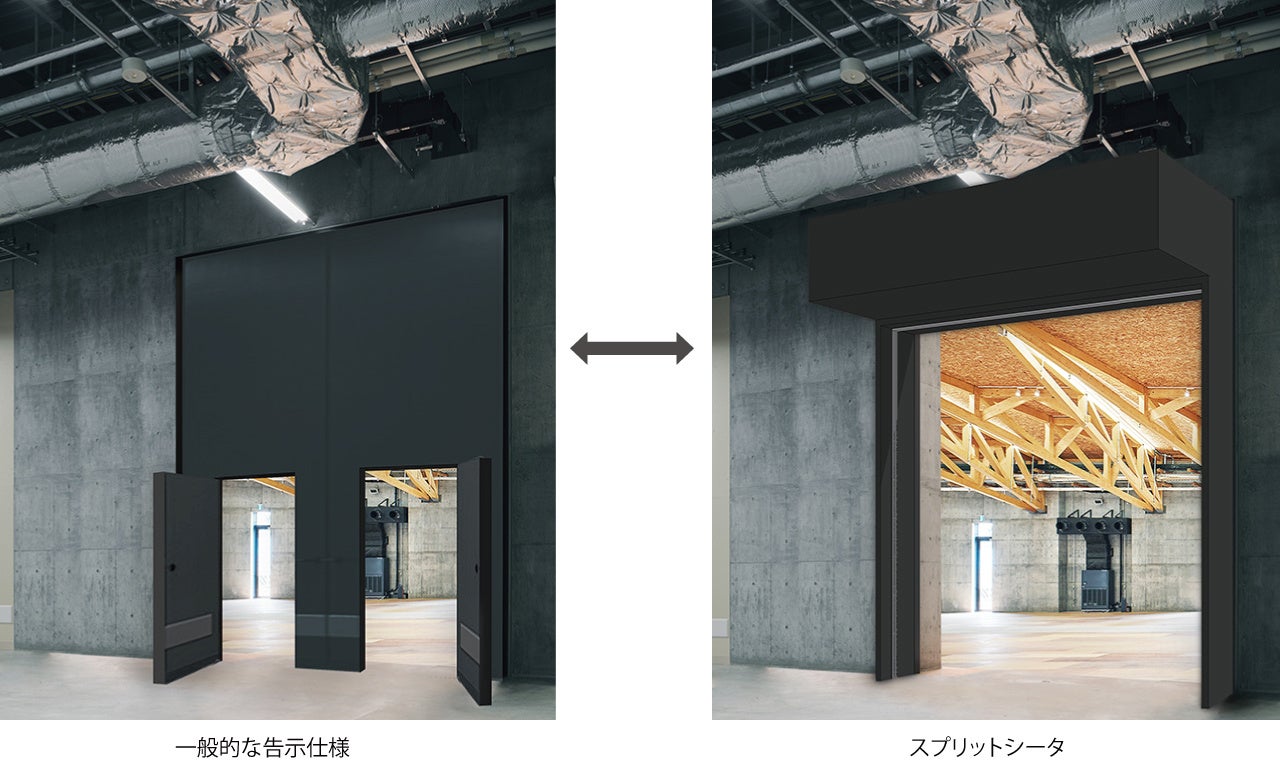 スプリットシータは、火災発生時に自動的に閉まる仕組みのため、常時閉鎖する必要がありません。告示仕様(※2)では防火扉で閉塞(へいそく)感のあった場所がスプリットシータ導入により大きな開口部となることから、建築物に連続した空間による開放感を持たせることが可能です。