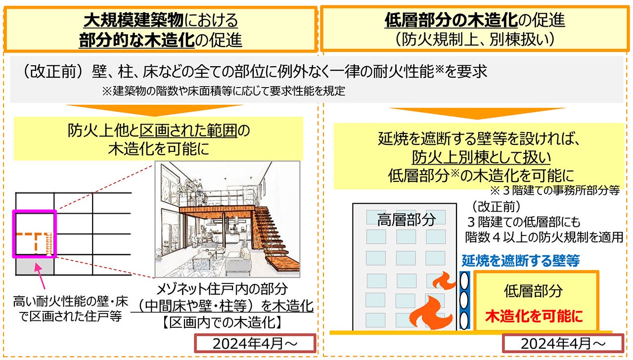 スプリットシータは、2024年4月に施行された法改正(※3)により実現可能となった「部分的な木造化(部分木造)」や、「低層部分の木造化(耐火別棟)」などの区画の開口部に要求される性能を満たす、90分間の遮熱性能を有する防火設備として国土交通大臣認定を取得しました。