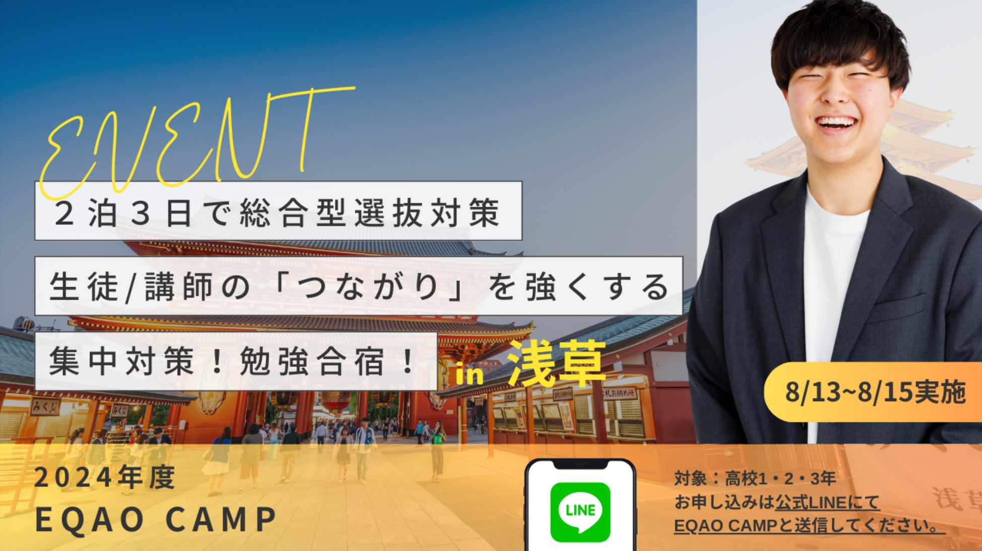 【夏休みは2泊3日で書類完成!EQAO CAMP参加者募集!】講師や仲間と切磋琢磨し、総合型選抜入試の書類準備を行う勉強合宿を浅草で開催します!高1~3年生の参加者募集中!