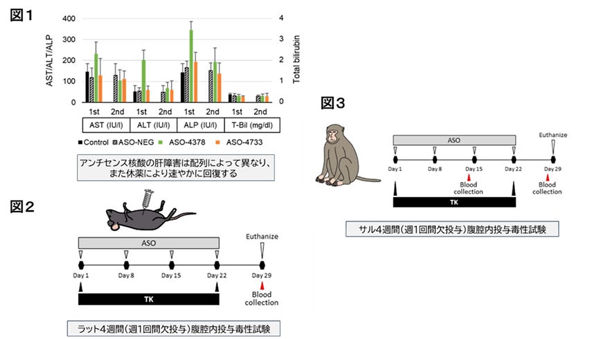 これまでに複数の動物実験によるASO-4733の安全性試験を実施してきました。まず、本来の標的以外の遺伝子に作用してしまう「オフターゲット効果」について検討したところ、ASO-4733は他の遺伝子への影響が極めて少なく、標的特異性に優れていることが確認されました。一般に、アンチセンス核酸医薬品は高用量投与により肝障害を引き起こす可能性が指摘されていますが、マウスにASO-4733を投与後、2週間(図1の1st)及び休薬2週間後(図1の2nd)の血液検査において、高用量群では一時的に肝胆道系酵素の上昇が見られたものの、休薬により速やかに回復することが確認されました。さらに、ラットを用いた4週間の反復投与毒性試験では、一部の個体で体重減少や血液検査値の変化が見られたものの、致死的な毒性や重篤な臓器障害は認められませんでした(図2)。また、カニクイザルを用いた4週間反復投与毒性試験においては、臨床想定投与量の50倍という高用量でも、全身状態の悪化や主要臓器への明確な有害影響は認められず、全体として良好な安全性プロファイルが示されました(図3)。これらの結果から、ASO-4733のヒトにおける初回投与試験を実施することは可能であると判断されています。
