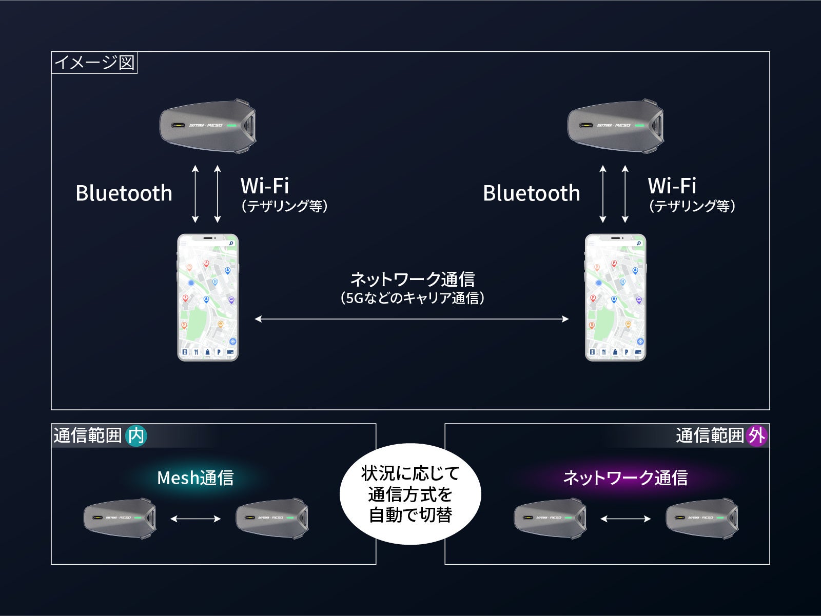 メッシュ通信の通信範囲内はメッシュで接続し、通信範囲を超えると自動的にネットワーク通信へ切り替わる通信方法。状況に応じて通信方法をシームレスに切り替えることで、常に安定した会話を楽しめます。